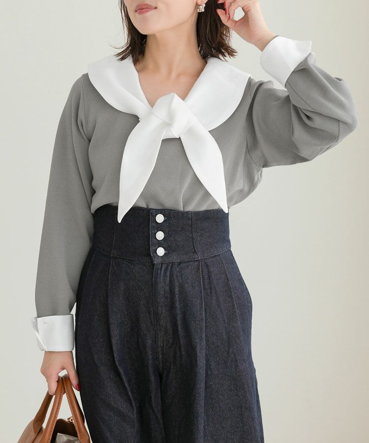 セーラーカラーがお顔周りを華やかにし、結び方アレンジで自分らしい着こなしも。