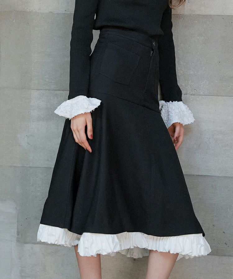 シンプルなブラックベースだから、カジュアルなニットと合わせる時は裾フリルを外して甘すぎず大人可愛いをアクセントに。