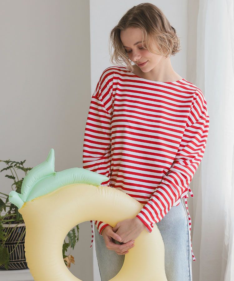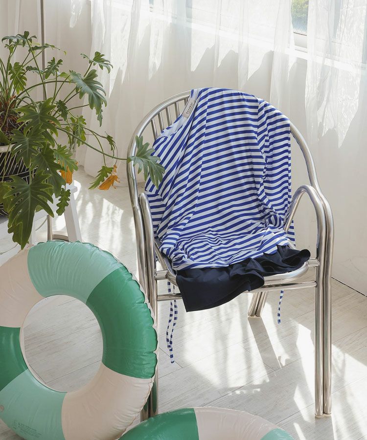 娘がラッシュガードを探していたときに、たまたまインスタライブをされていて、これいいやん!と娘に見せると気に入って購入しました。小学生の息子とプールいくとき私も着ました! 明るい夏らしいブルーのボーダーが爽やかで好きです。黒のスカラップショートパンツにも合いました。