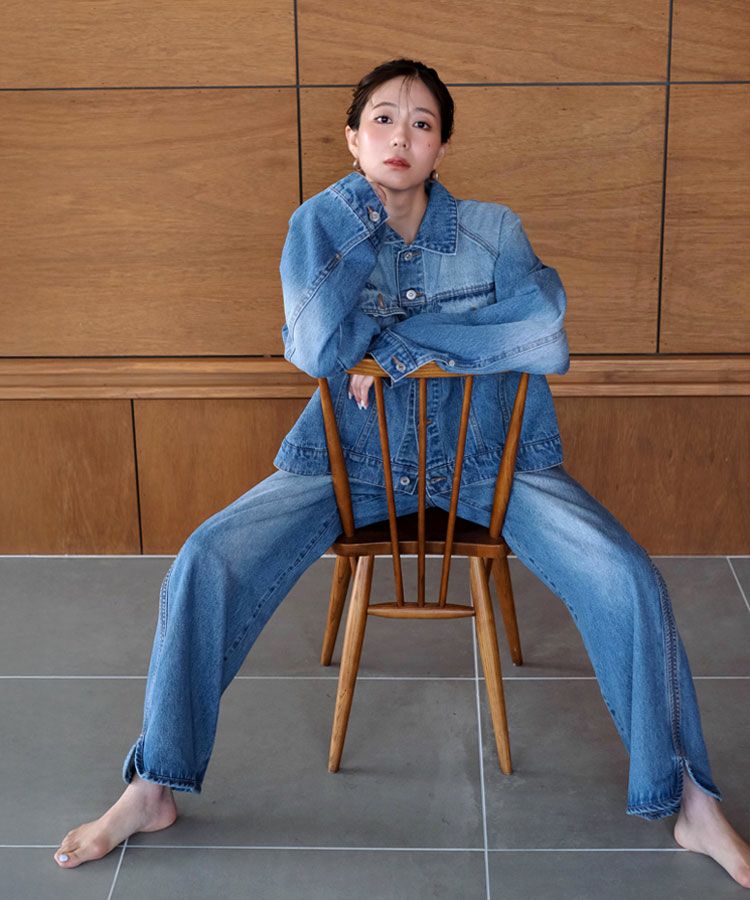 フレアデニムジャケットにストレートデニムのセットアップで私らしい、かっこいいコーデ。ロングパールネックレスを斜めがけして、クールさの中にほんのり女性らしさをプラス。