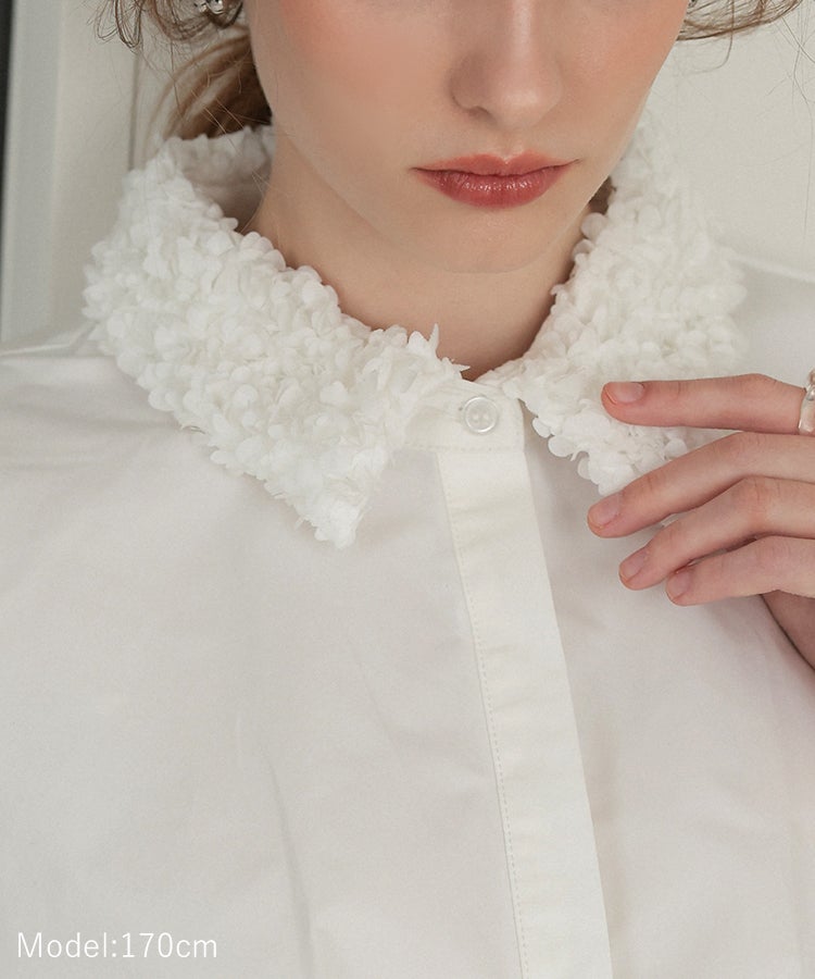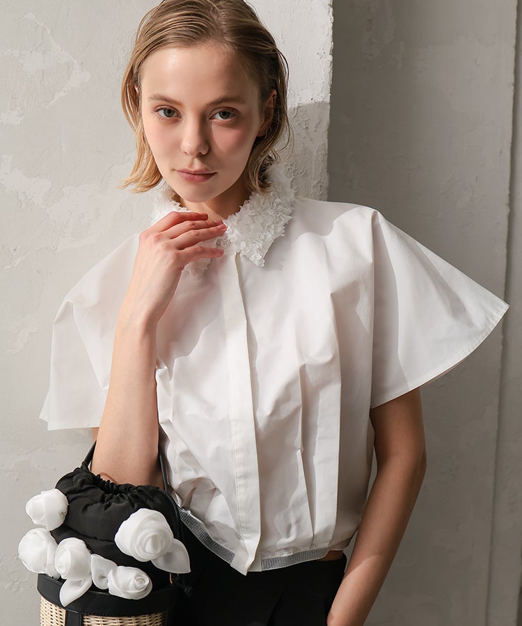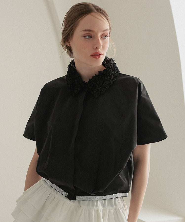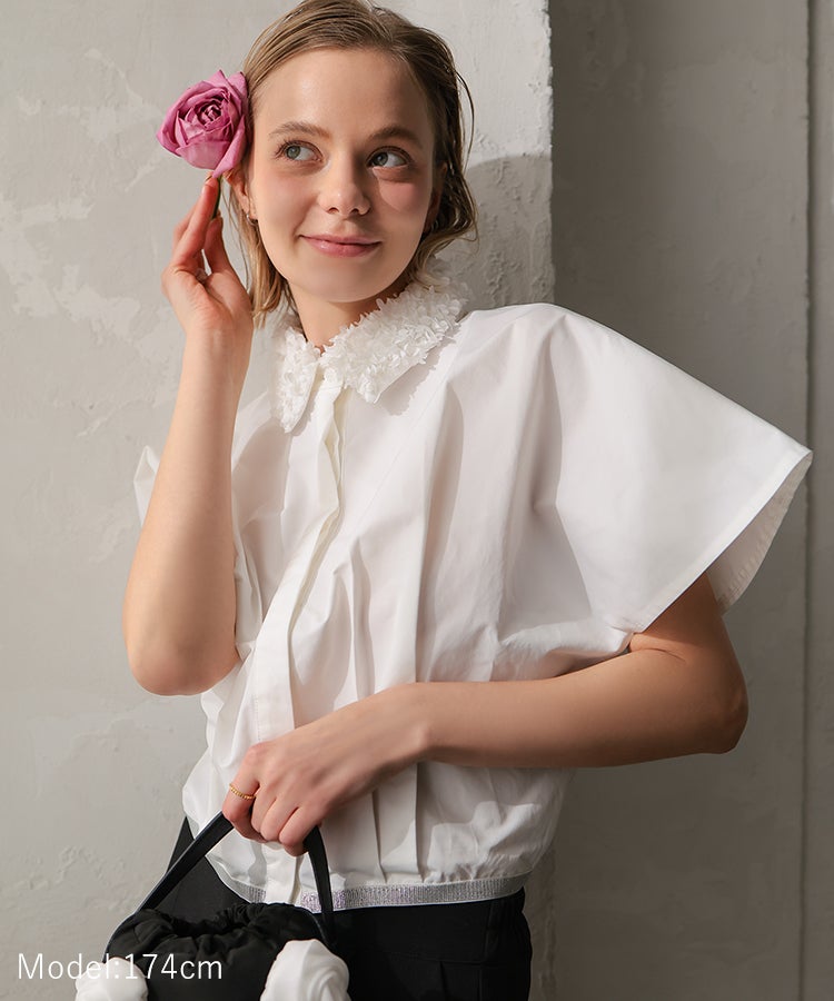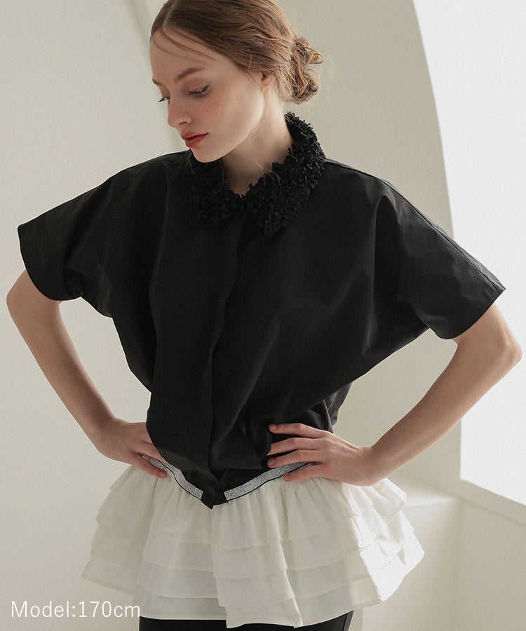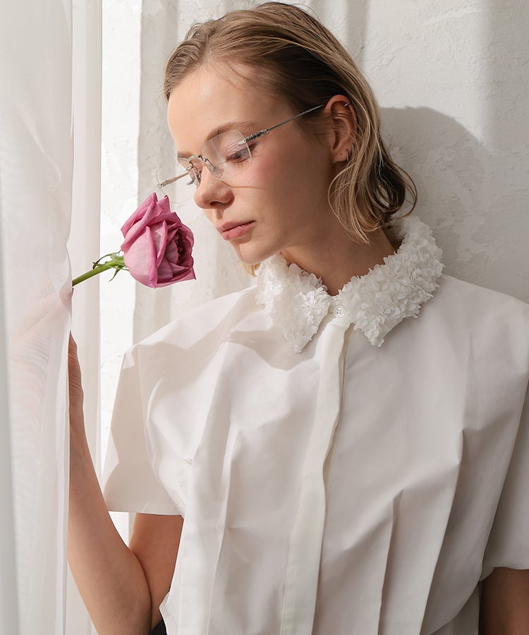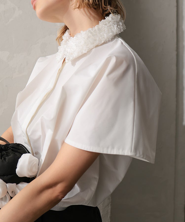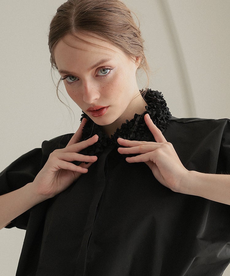 立体感のあるフラワーモチーフの襟が目を惹く、存在感たっぷりのデザインブラウス。