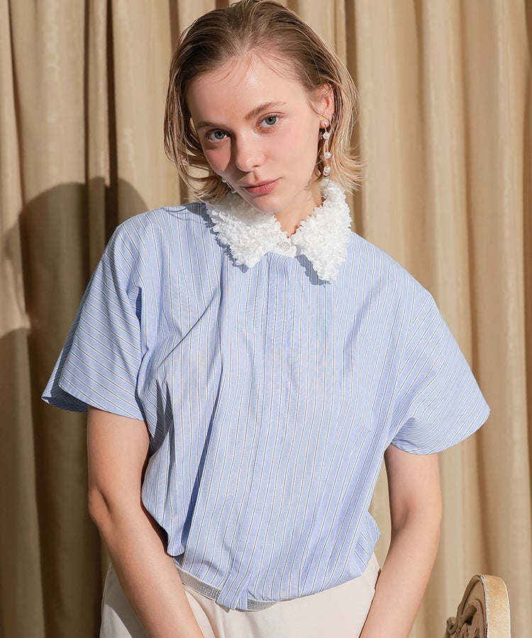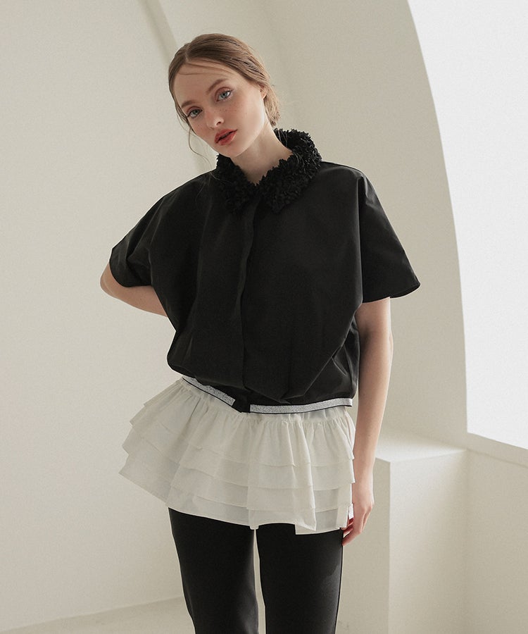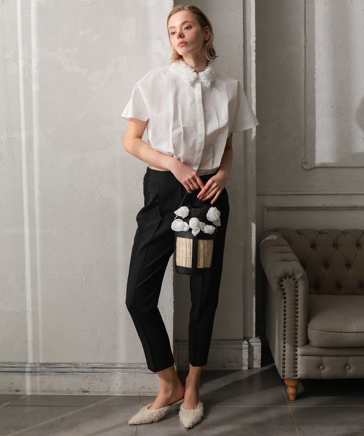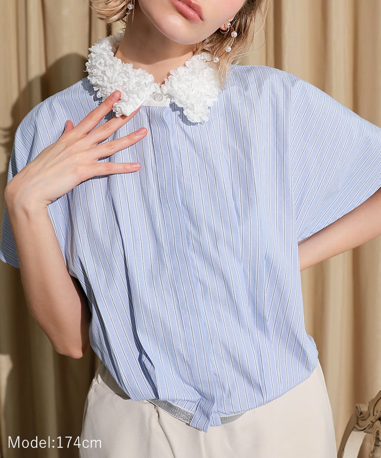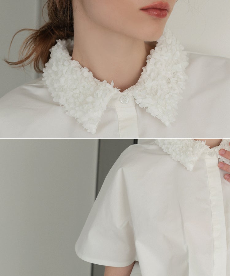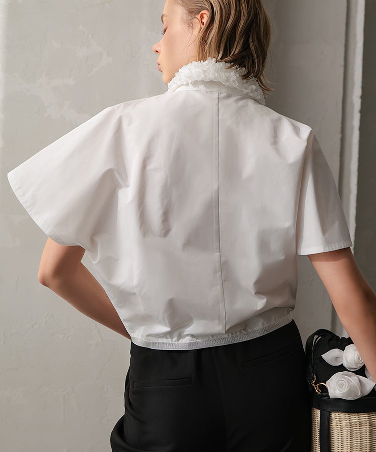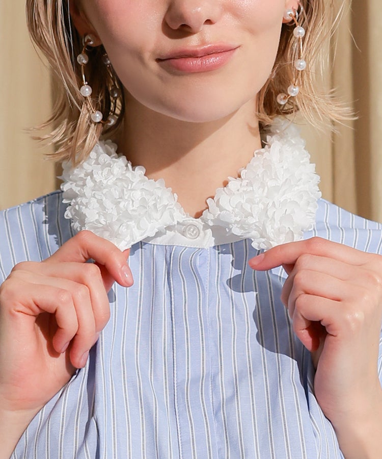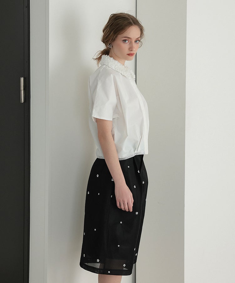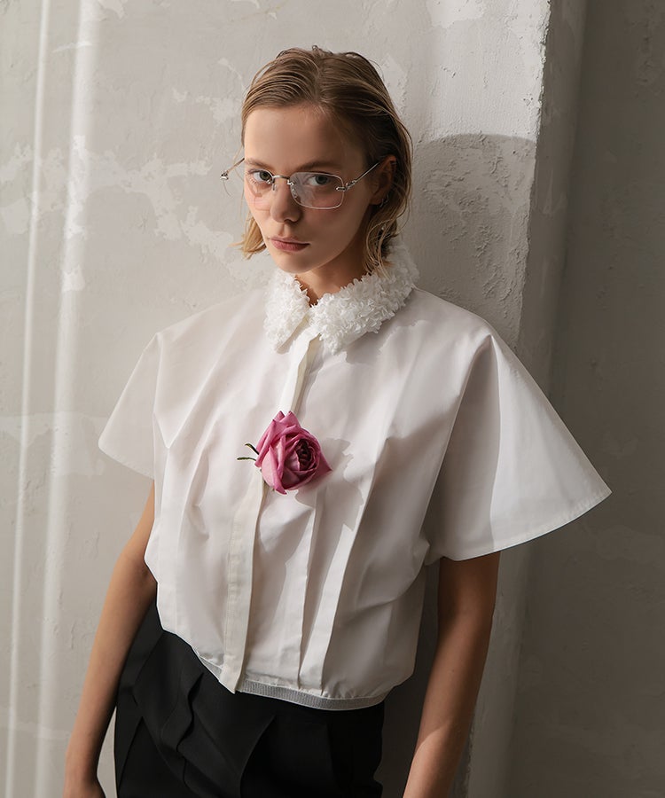 立体感のあるフラワーモチーフの襟が目を惹く、存在感たっぷりのデザインブラウス。