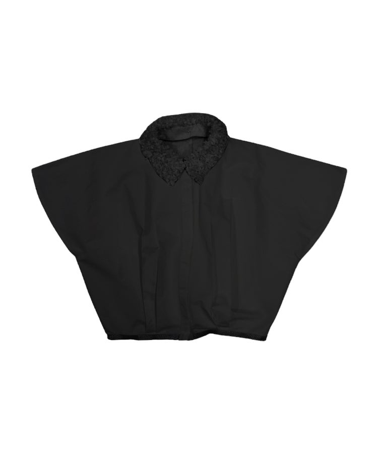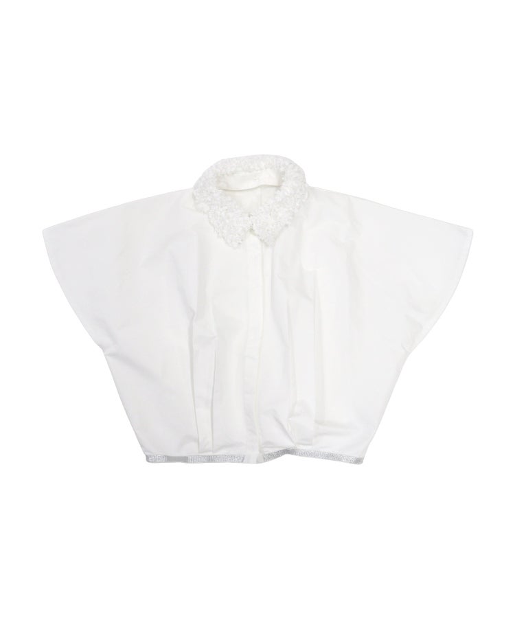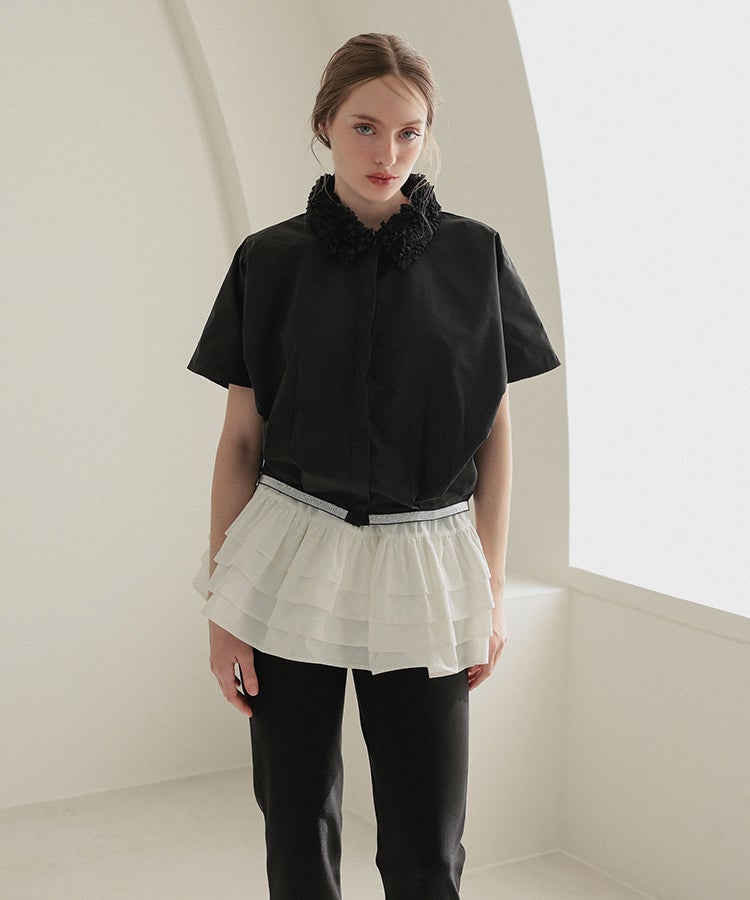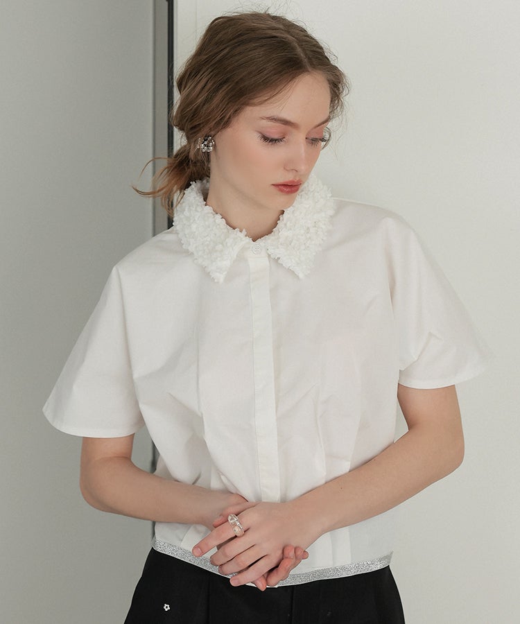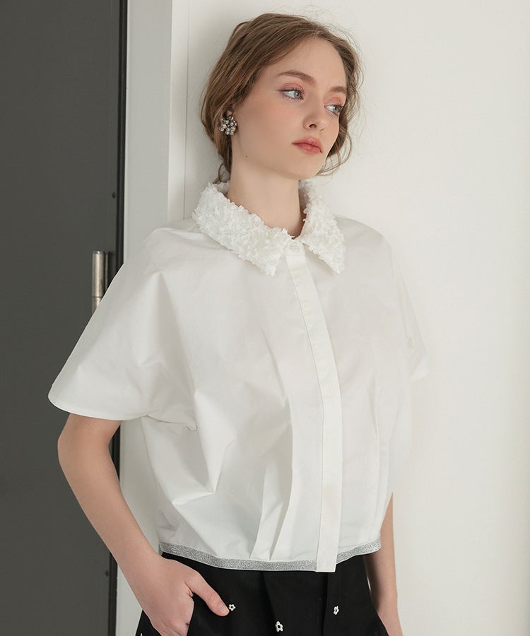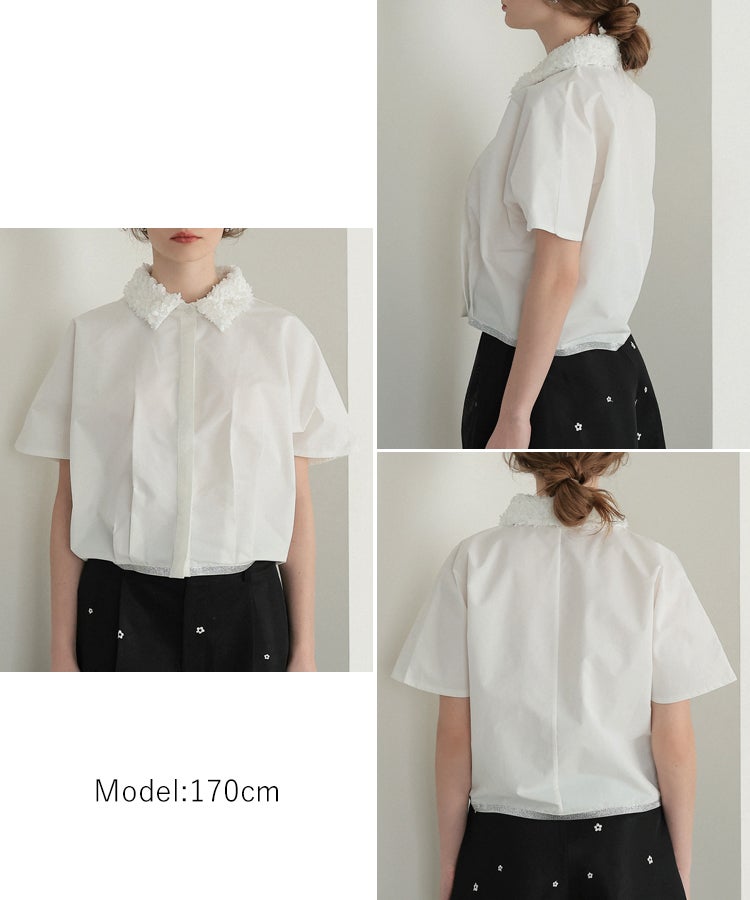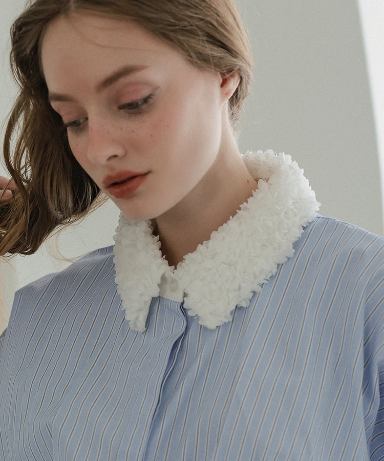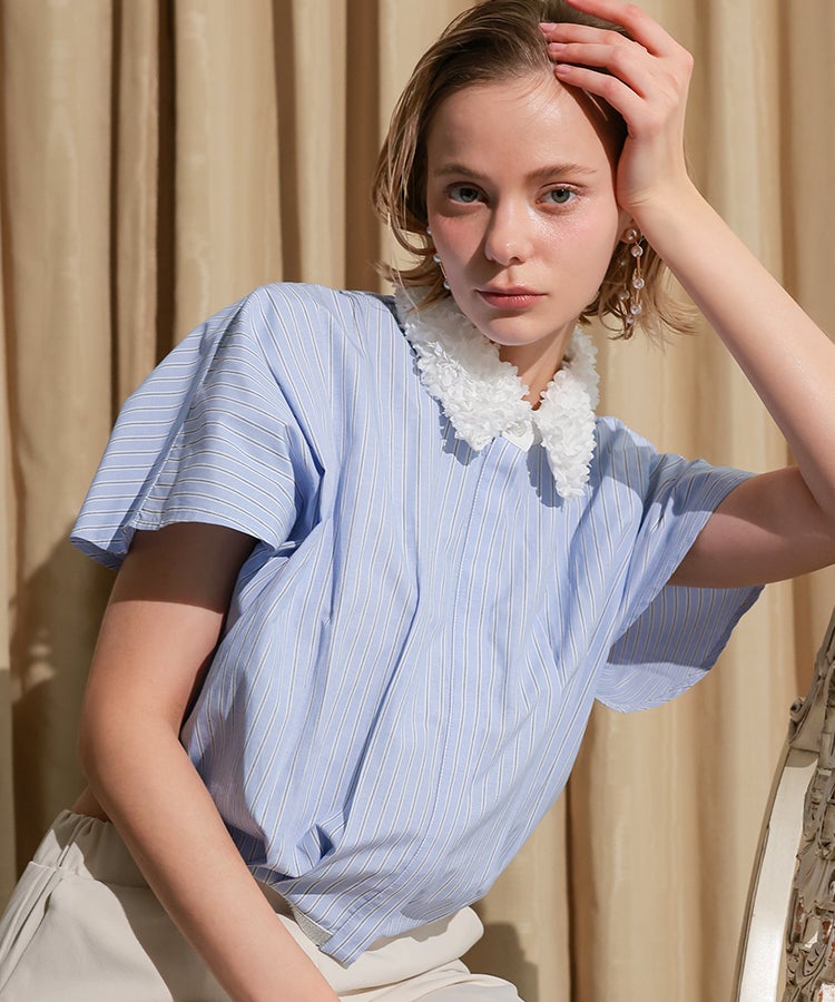立体感のあるフラワーモチーフの襟が目を惹く、存在感たっぷりのデザインブラウス。