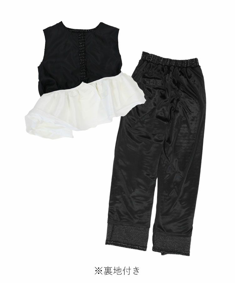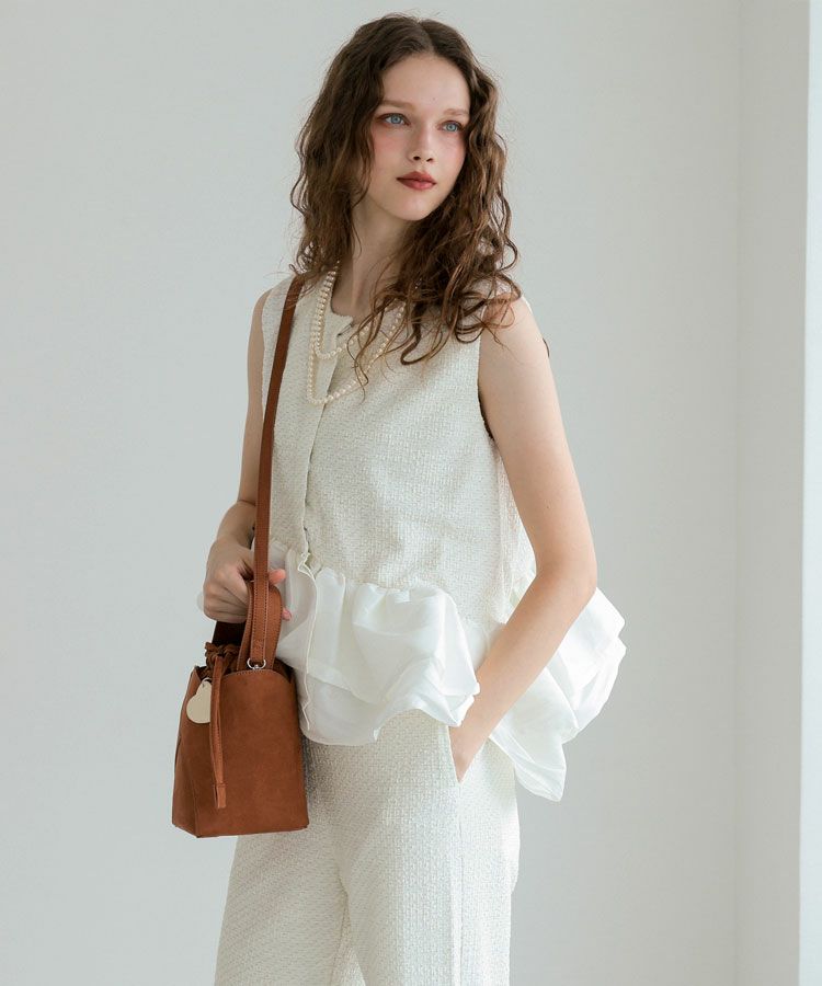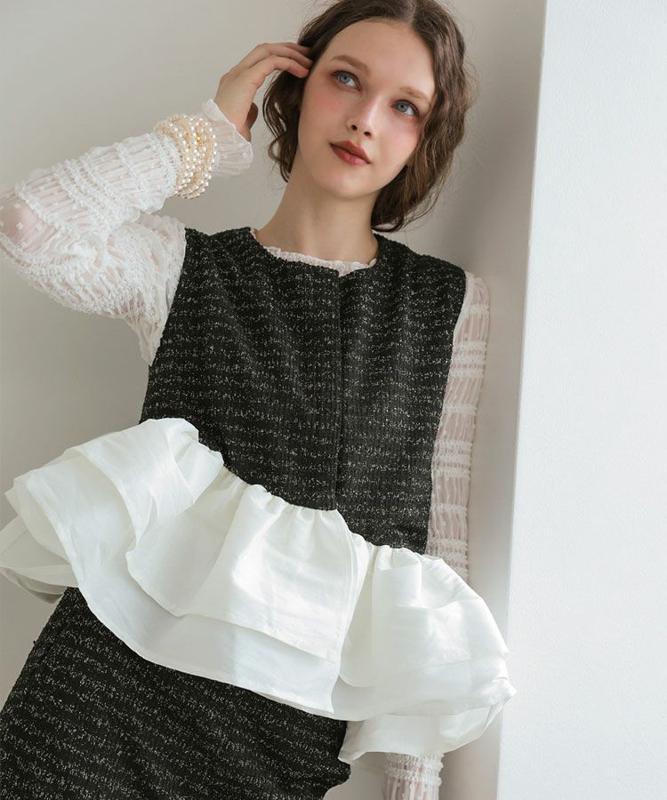 トップスはノースリーブデザインに、裾のフリル切り替えで華やかさをプラス。