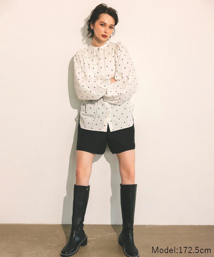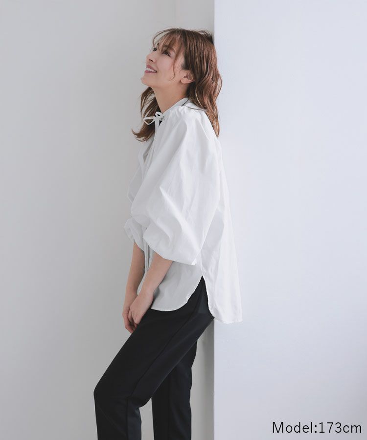 ピンクのストライプが映えるシャツに、おち感のあるドレープパンツを合わせた大人のキレイめコーデ。オフィスから休日まで、幅広く活躍◎