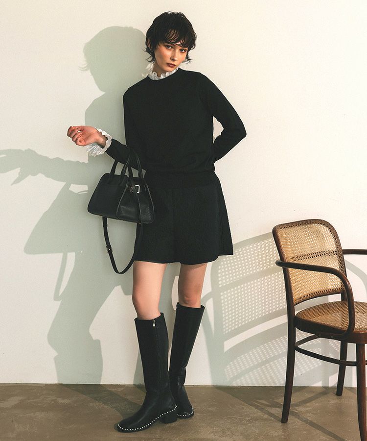 キルティングのワンピースに重ね着にオススメのお袖がフリルのニットを合わせました。 ボリュームのあるブーツを選び大人カジュアルコーデにしました。