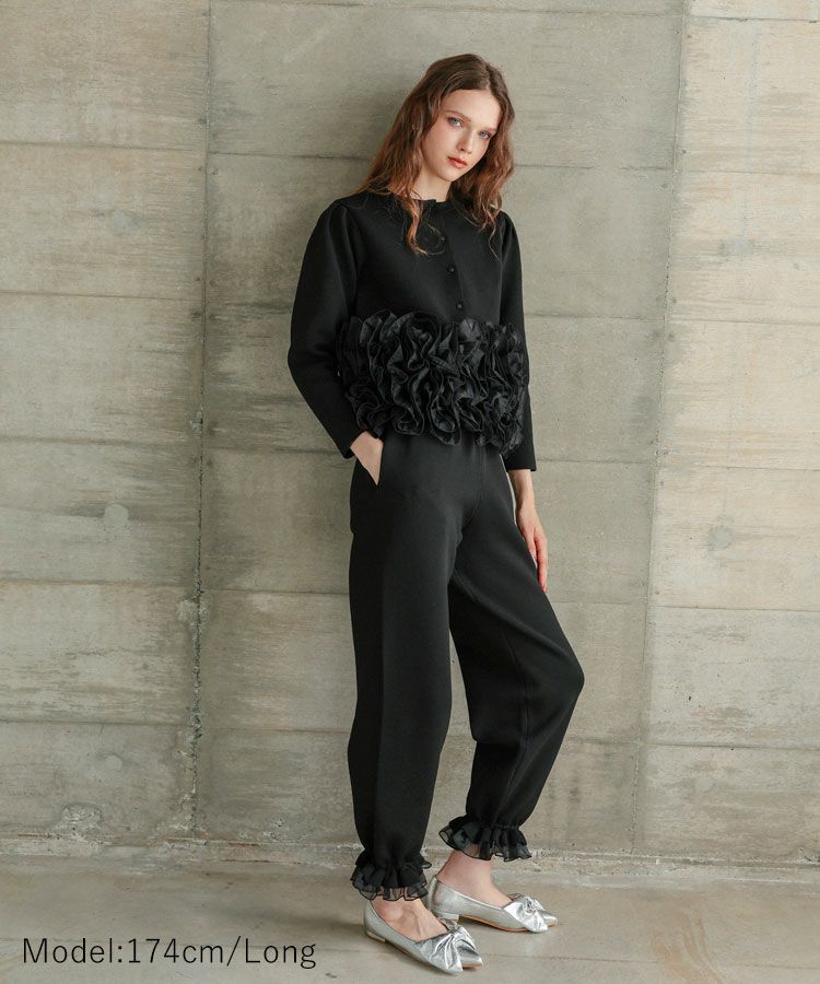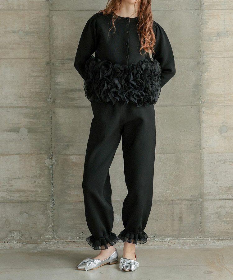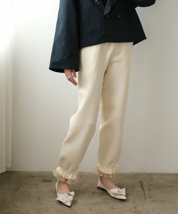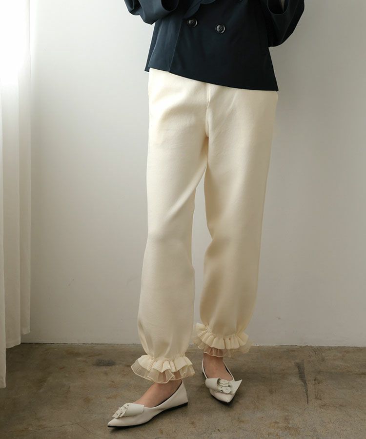 パンツはリラックスシルエットになっており裾のフリルがポイントに。
