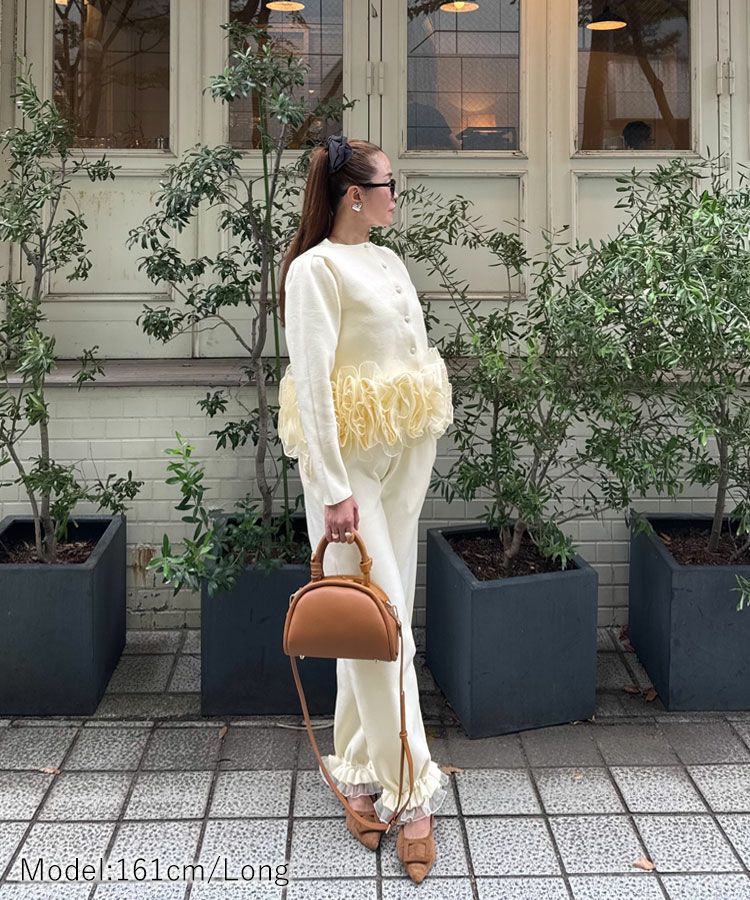フリルをふんだんにカーディガン、ボトムスに取り入れたDonobanらしい大人ガーリーに仕上げました。