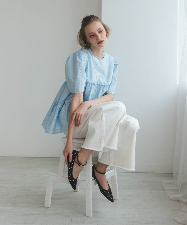ドット柄の可愛さとフレアシルエットの華やかさをデニムで程よくカジュアルダウン。甘めのトップスをデニムでラフに仕上げた、大人かわいいミックススタイル。