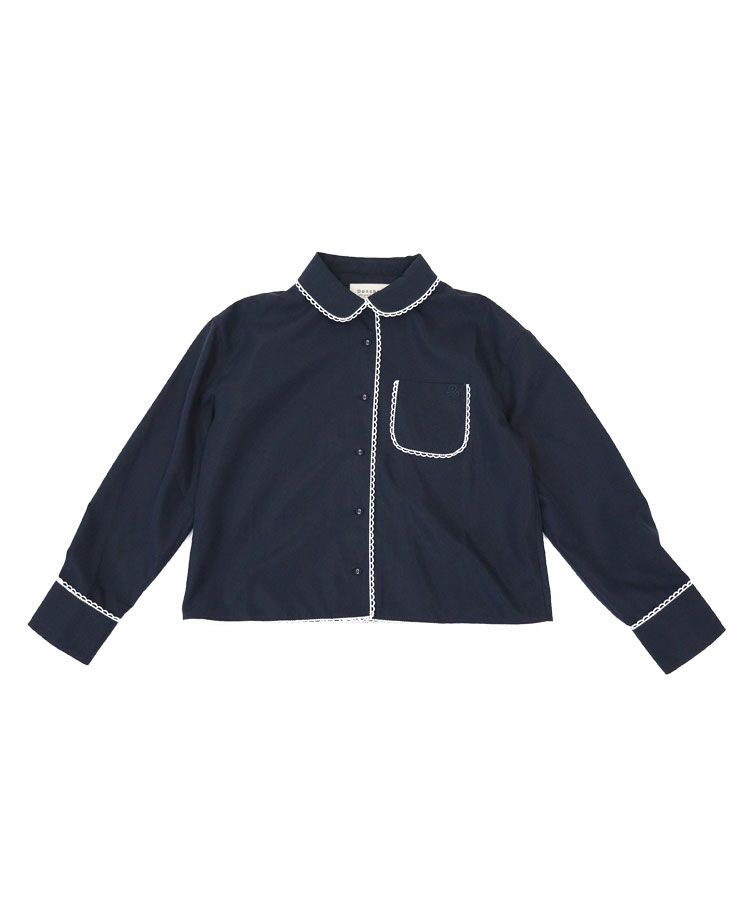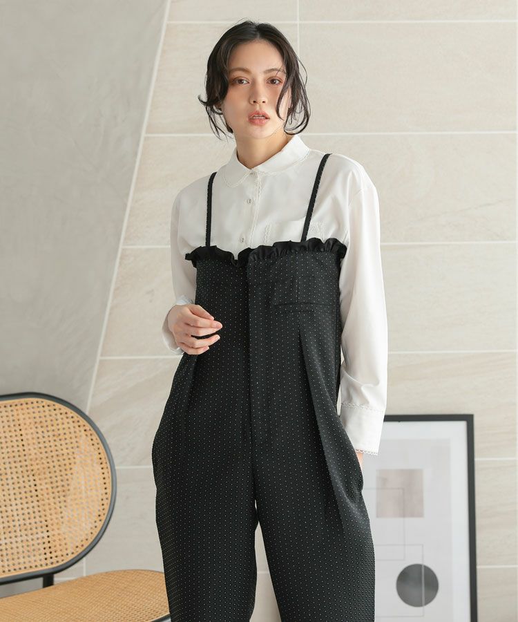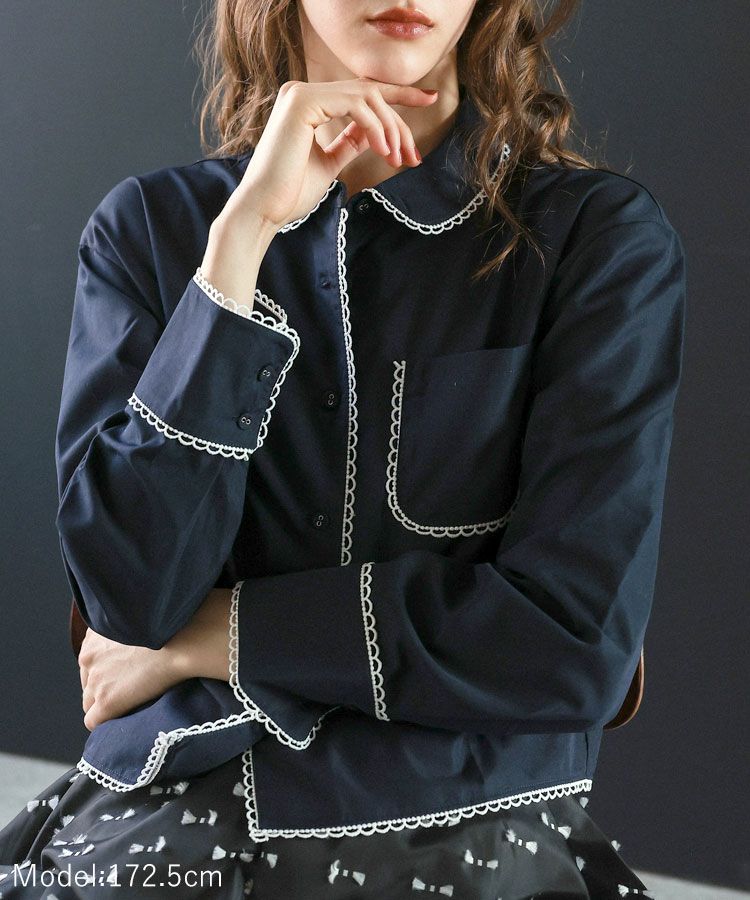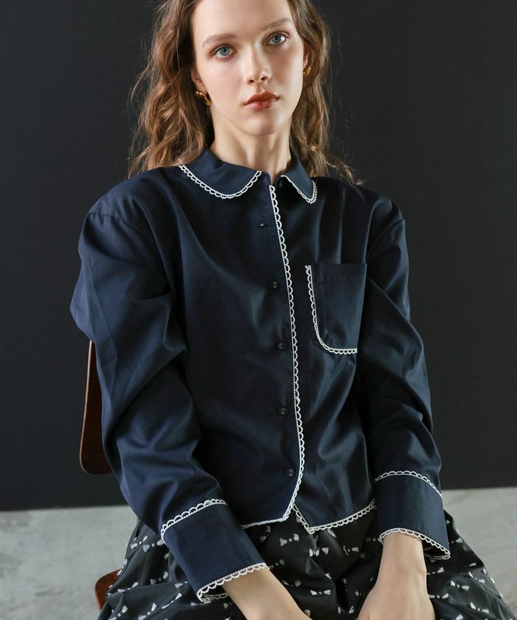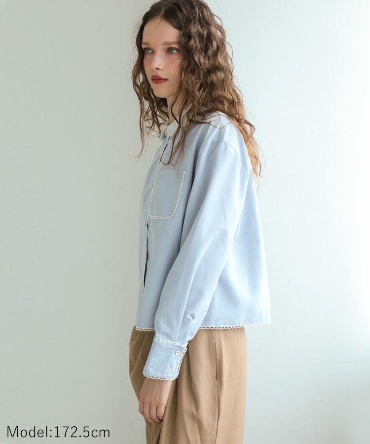スカラップデザインが目を惹くブルーシャツに、落ち感のきれいなキャメルパンツを合わせた大人フェミニンな着こなし。ロングパールネックレスで品よくまとめたバランスの取れたコーデ。