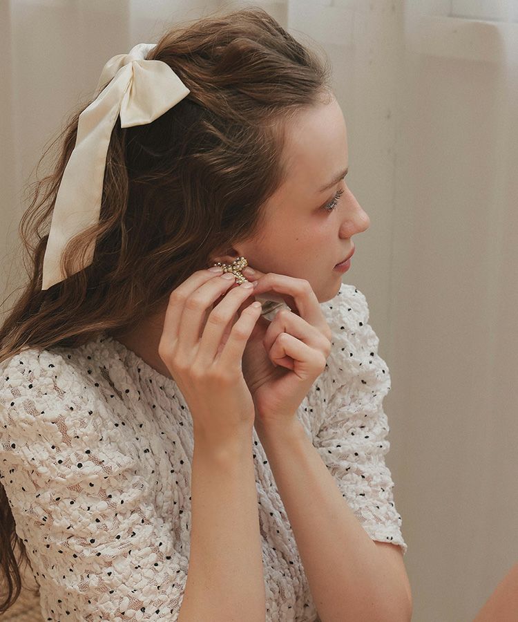 大ぶりなリボンモチーフに、パールとビジューを散りばめたピアス。