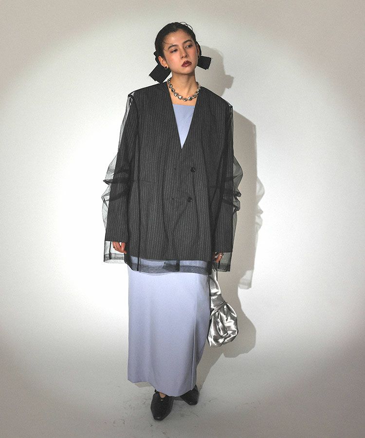 セレクトブランドのANDRESDのチュールトップスをカジュアルダウン。 シンプルコーデにプラスするだけで華やかに。 晩夏にもぴったりのアイテムです。