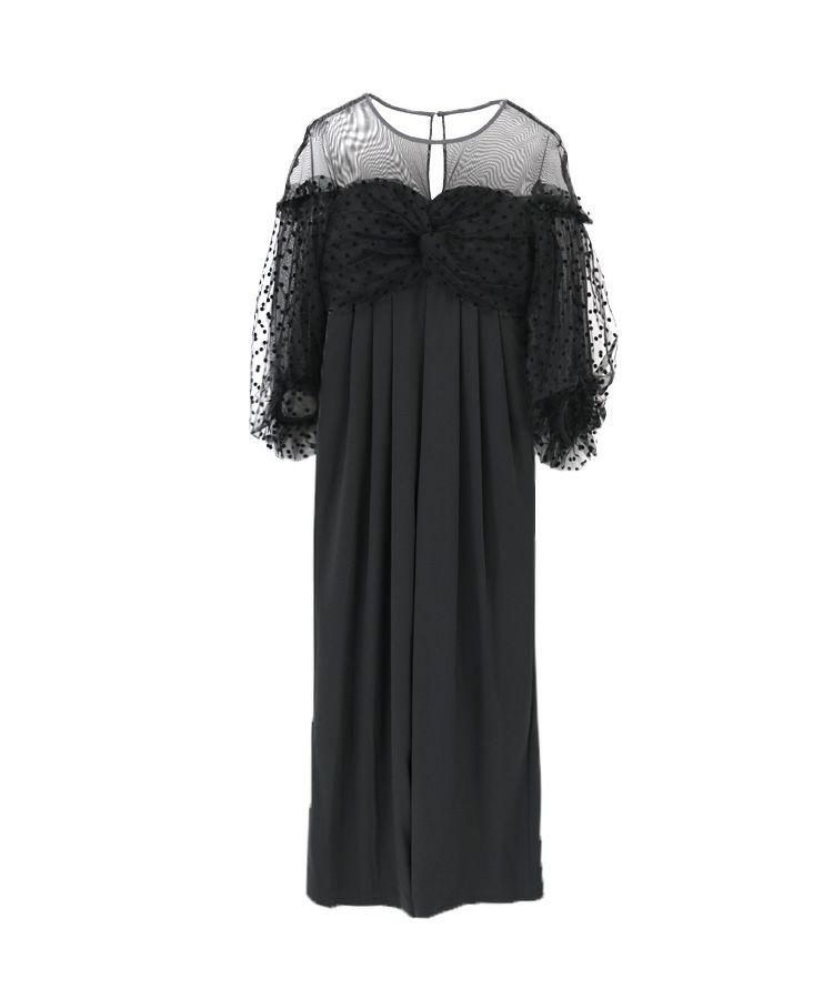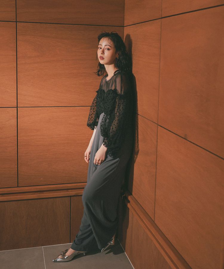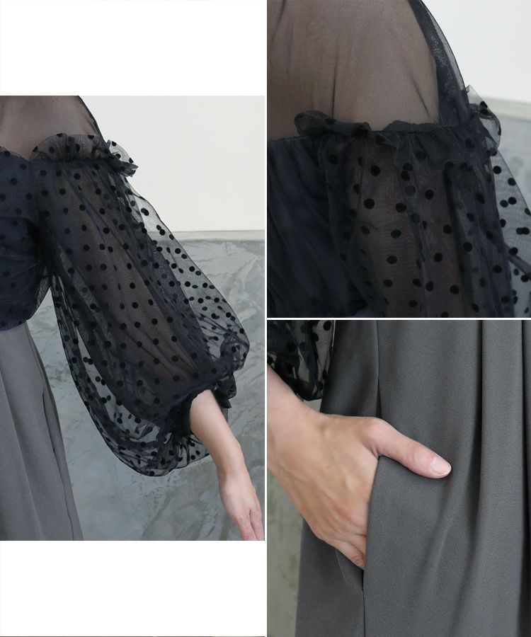 ふんわり軽やかなチュールを纏ったボリューム袖がファッショナブルな印象になり、デコルテや肩周りはチュールのシアー感を出して抜け感もプラス。