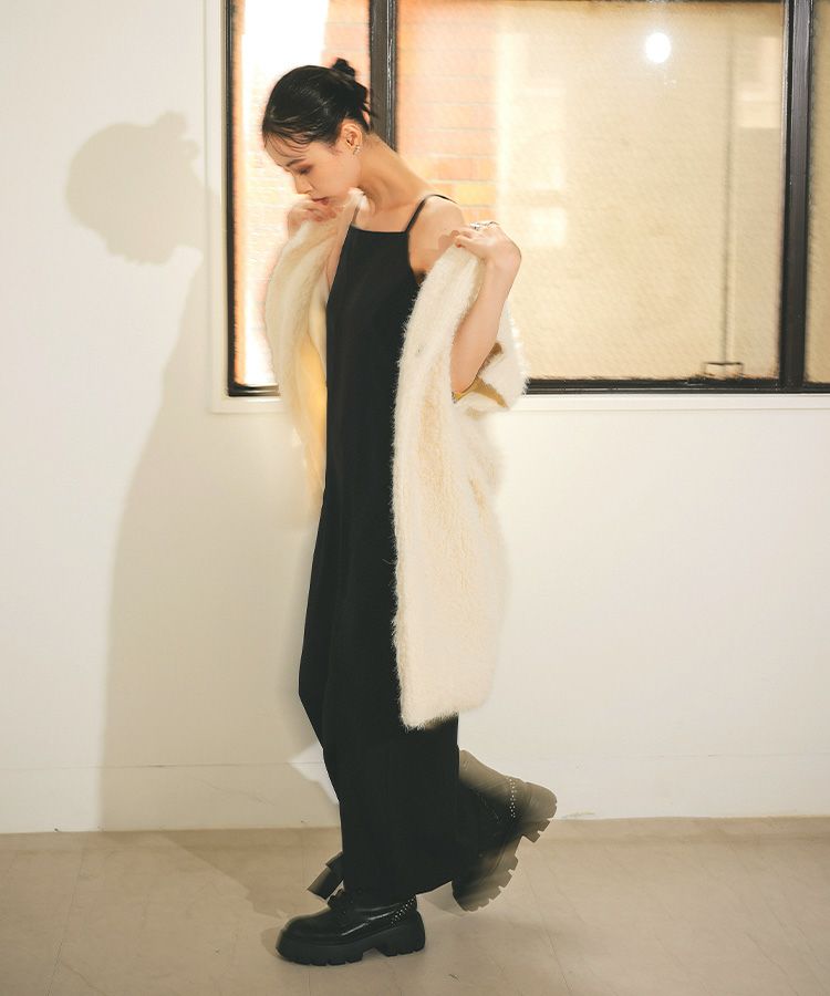 いやらしさのない程度の肌見せバランスとセミタイトシルエットながらも、からだのラインを拾いすぎない素材とシルエットが、クールな女性像を引き出し、しなやかな大人のムードに引き上げてくれます。