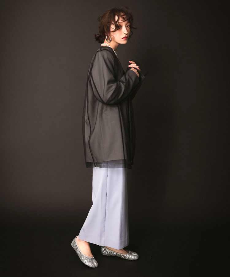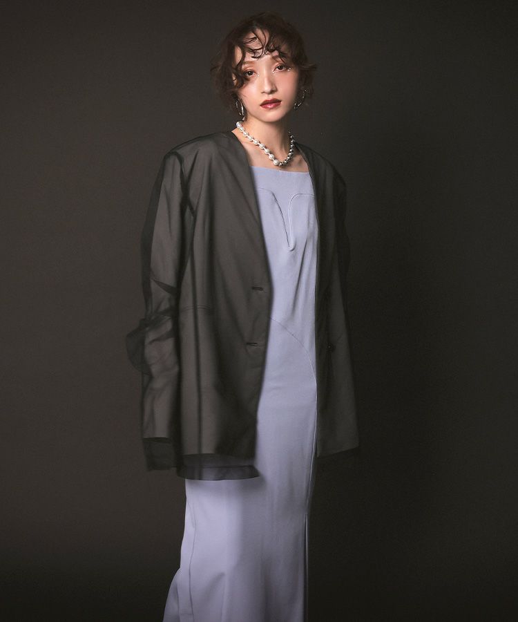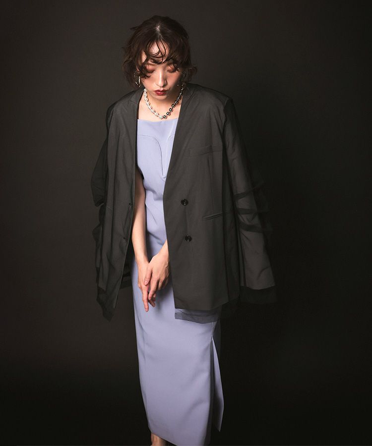 形自体はシンプルながらもポリエステル×レーヨンのツイル素材にボクシーシルエットで 少しメンズライクなカラーレスジャケットに仕上げました。
