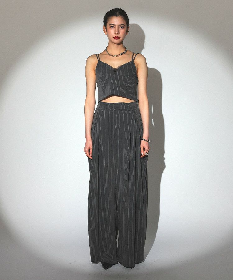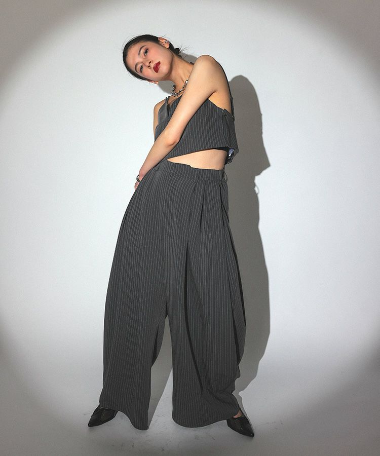 ボリューム感たっぷりのコクーンワイドパンツと、コンパクトなビスチェの組み合わせ。