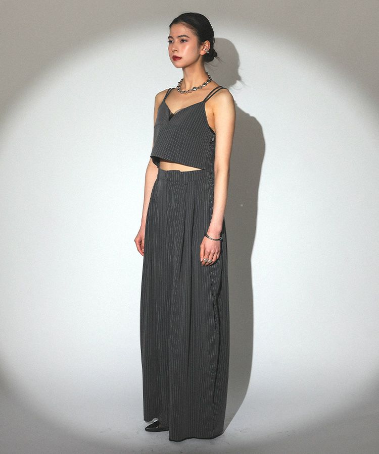 マニッシュな印象を引き立てるピンストライプ素材が魅力のパンツセットアップ。
