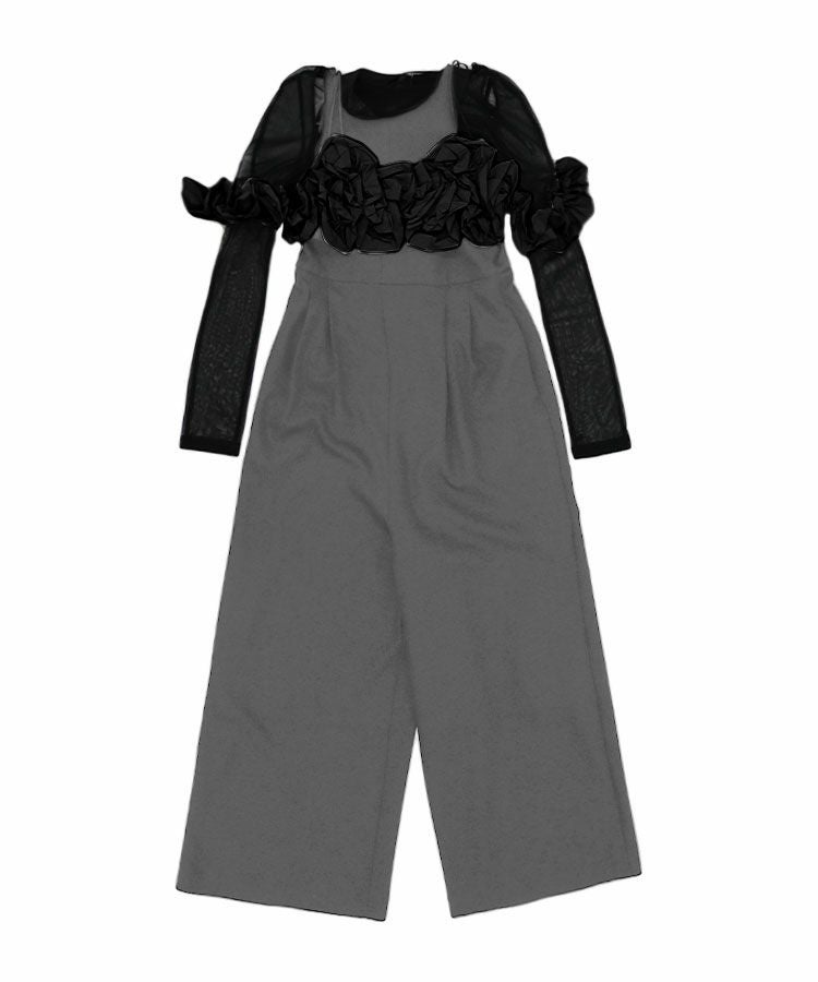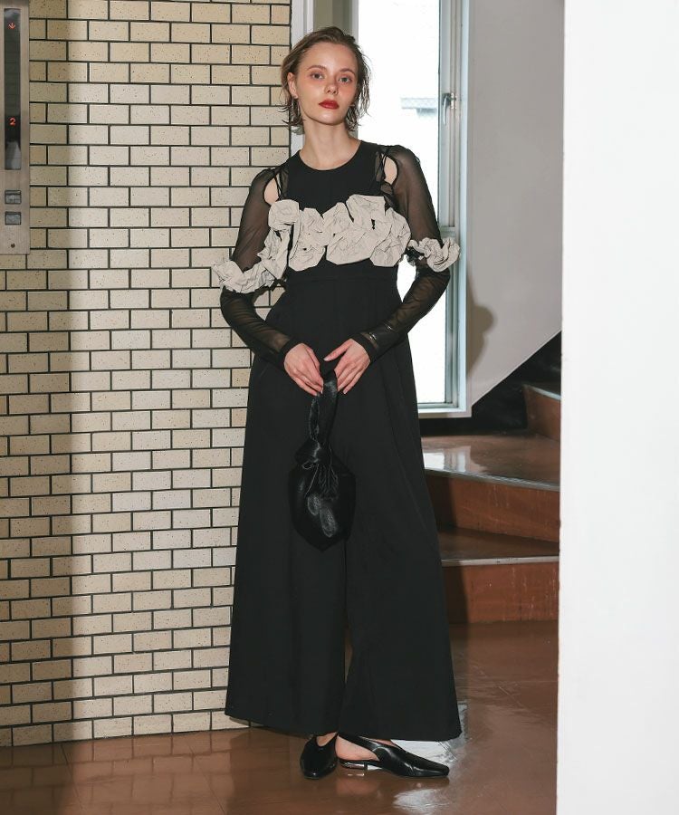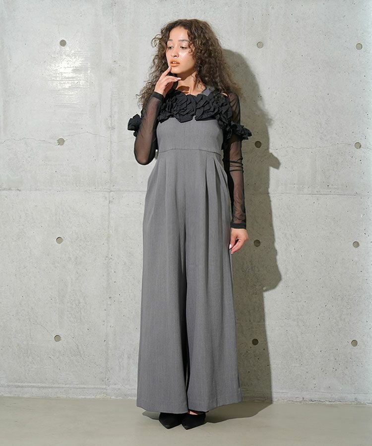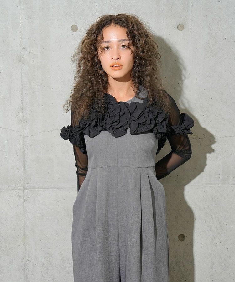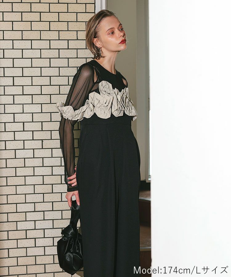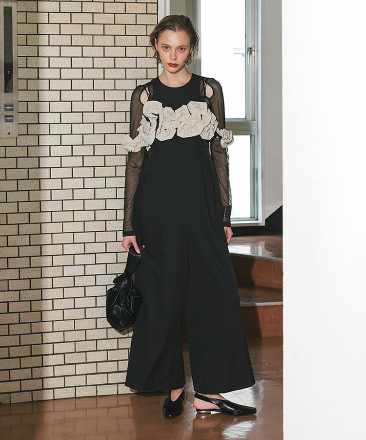 ボリュームフリルのビスチェを主役に、ワイドシルエットのオールインワンと透け感のあるインナーを組み合わせた、着こなし自在の3点セットアイテム。