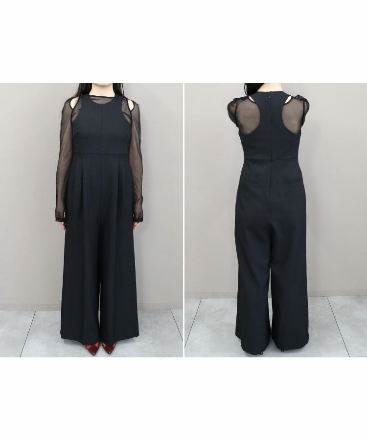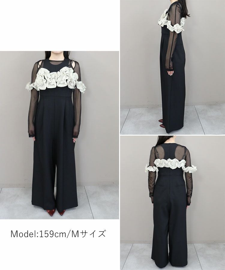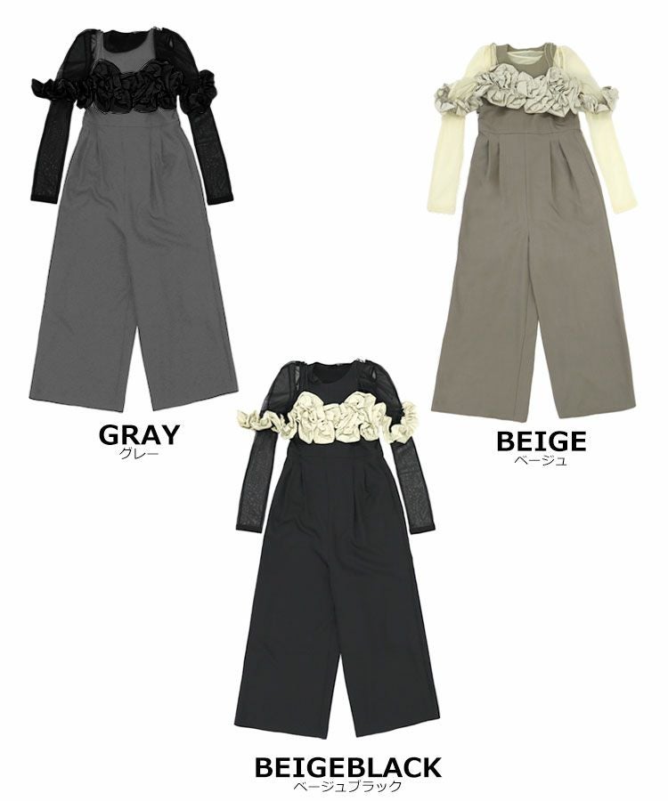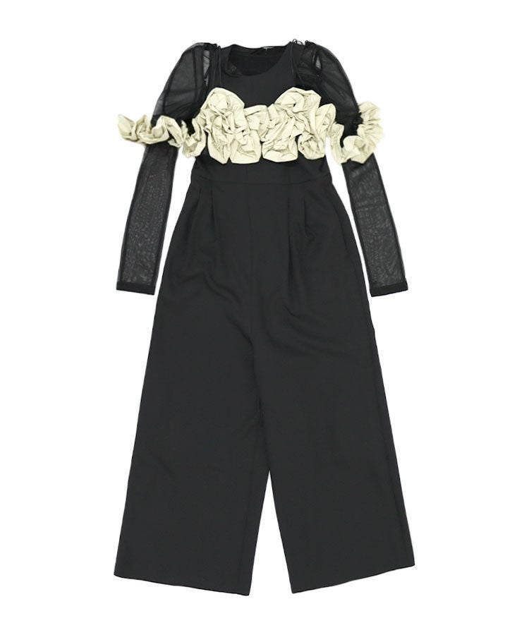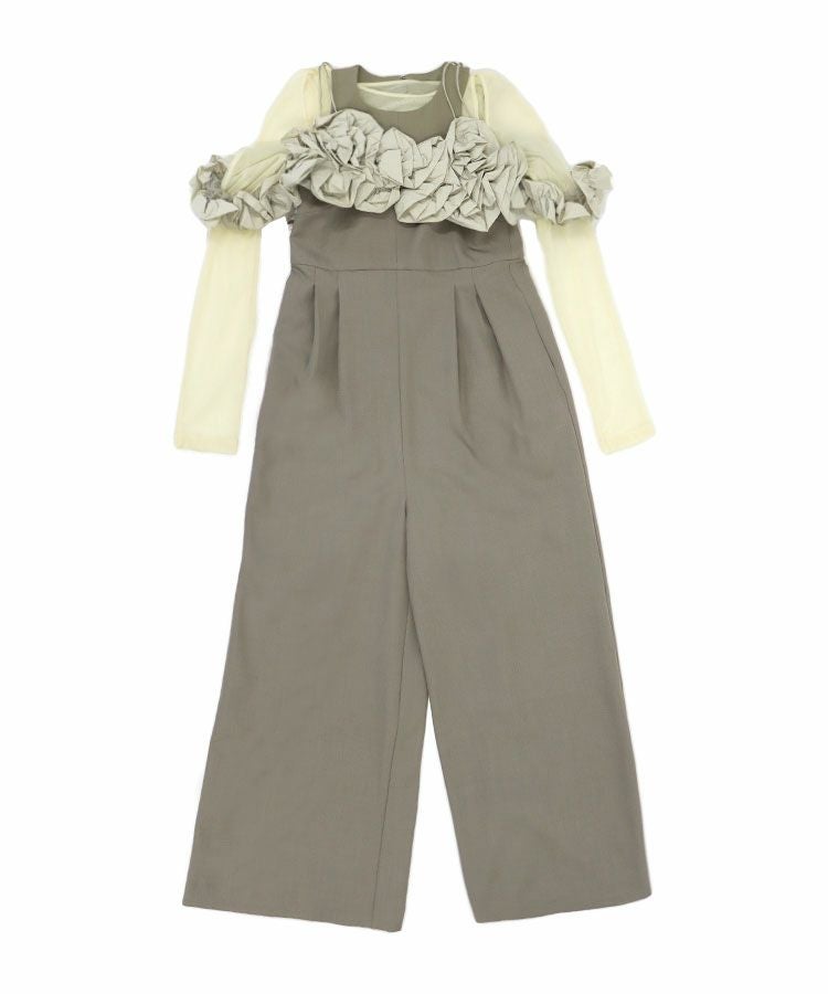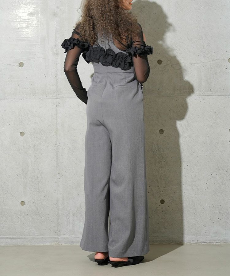 ボリュームフリルのビスチェを主役に、ワイドシルエットのオールインワンと透け感のあるインナーを組み合わせた、着こなし自在の3点セットアイテム。