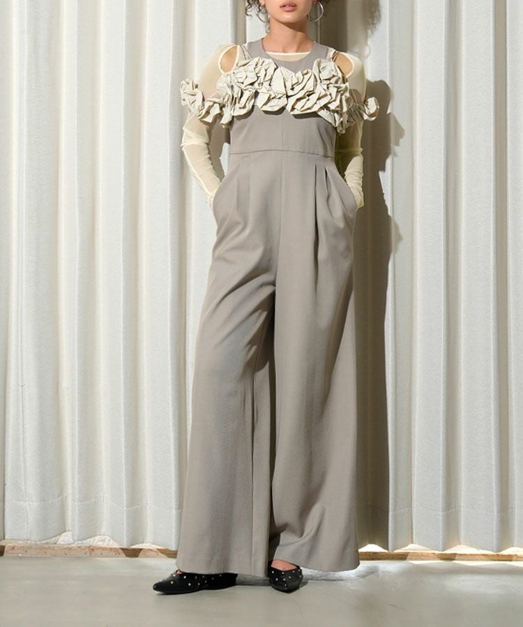 オールインワンはドライタッチで落ち感のある生地を使用し、美しいワイドシルエットを実現しました。