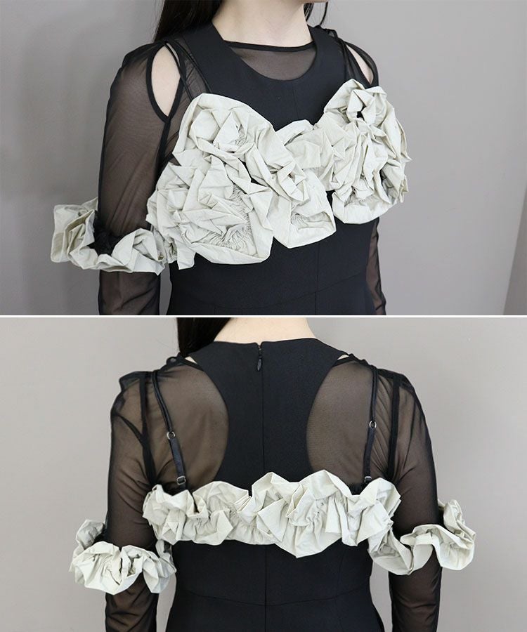 フリルビスチェは、オーガンジーの土台に異素材のボリュームフリルを施し、華やかさと立体感を演出。