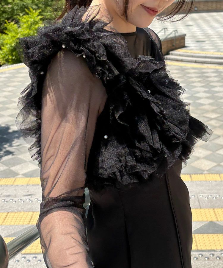 ボリュームフリルチュールと全面にパールを施し“派手すぎず、目を惹くバランス”にこだわった1着。
