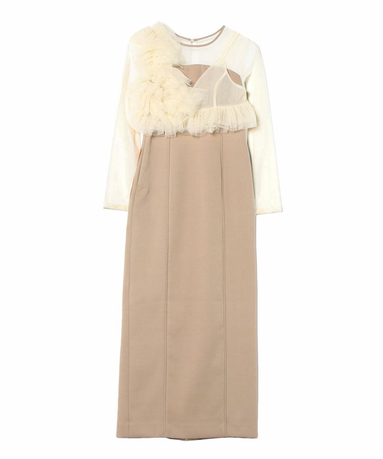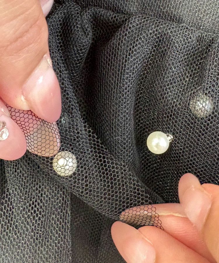 ビスチェにはランダムに散りばめたパールが目を惹くチュール生地を採用。