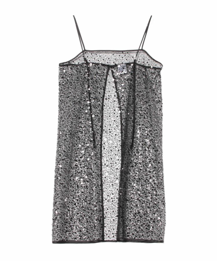 フリルを刺繍した立体感のあるレースに、ランダムにのせたスパンコールが光の当たり方や動きによって水面の様に揺らめいて輝く。