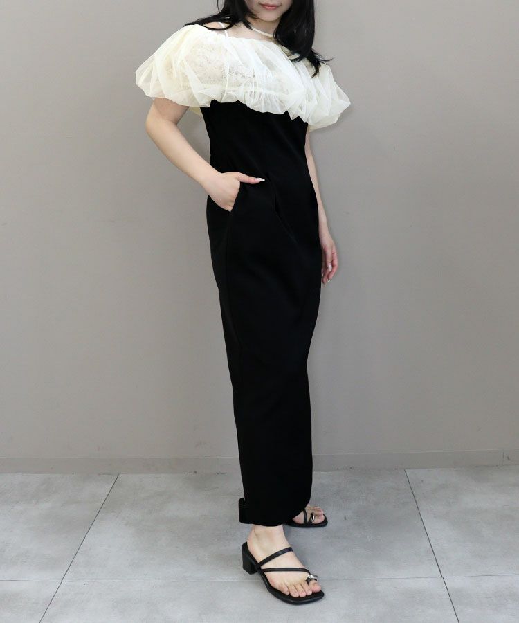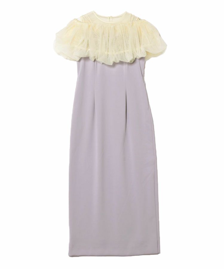 シアーでドライな質感のチュールと、ドレッシーな合繊生地を使用。