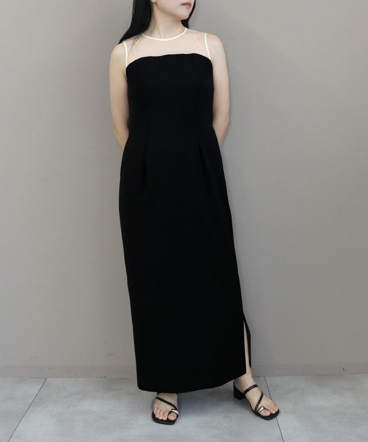 デコルテのほどよいシアー感が抜けをつくり洗練された印象に。
