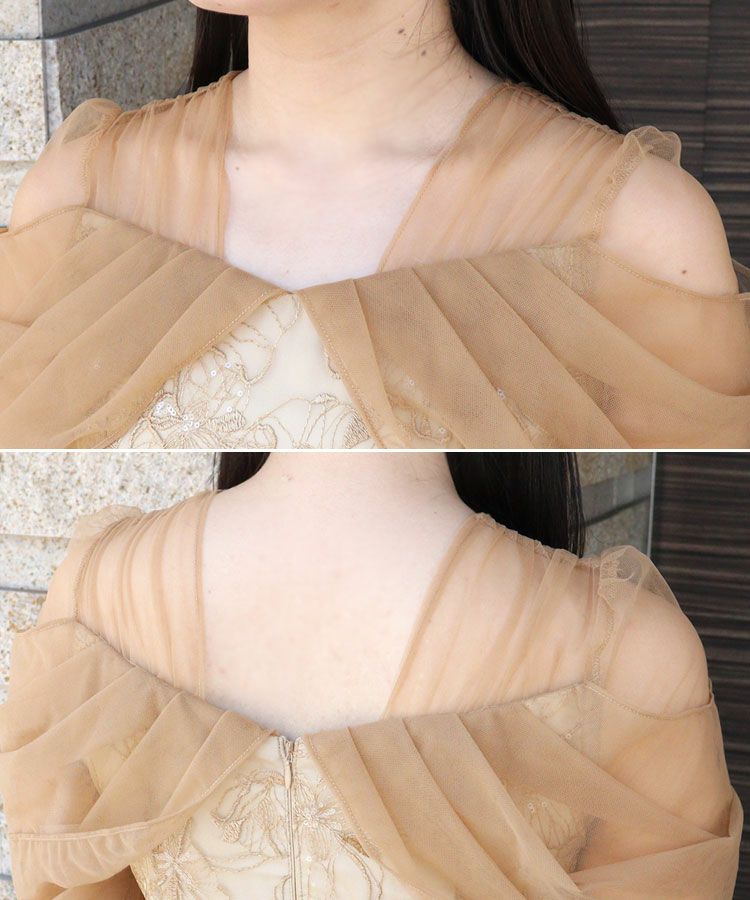 セミAラインのシルエットと、身頃から腕にかけたチュールのドレープで、女性らしい印象に。