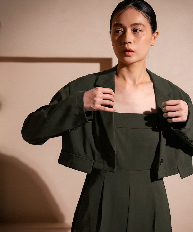 クロップド丈ジャケットとキャミオールインワンのセットドレス。