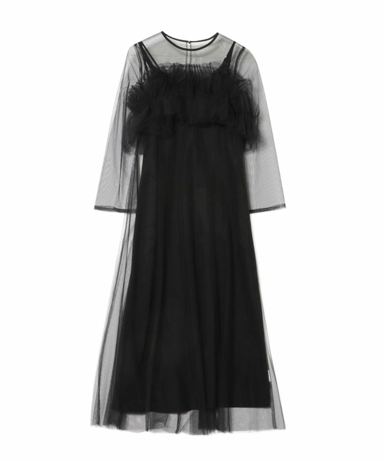 たっぷりのチュールを贅沢に使ったギャザービスチェと、軽やかなインナーワンピースを重ねたレイヤードドレス。