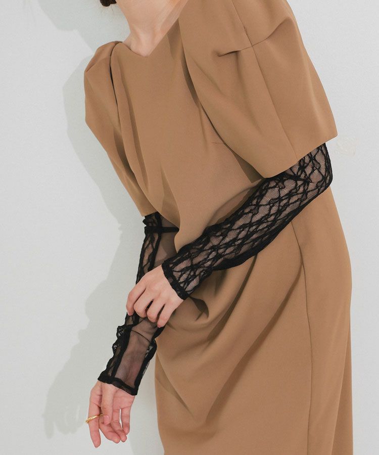 ストレッチ性のある繊細レースとチュールの切り替えで異素材の組み合わせでデザインしほんのりモードな印象に仕上げました。