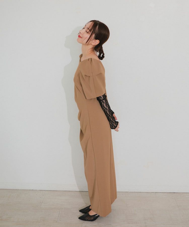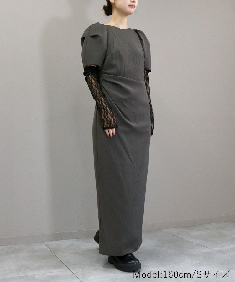 程よいとろみと落ち感のある素材で仕立てたワンピースに、レース×チュールのアームカバーをセット。