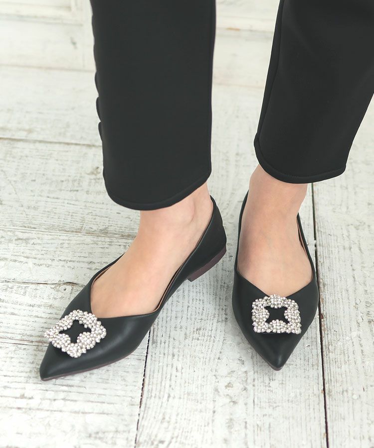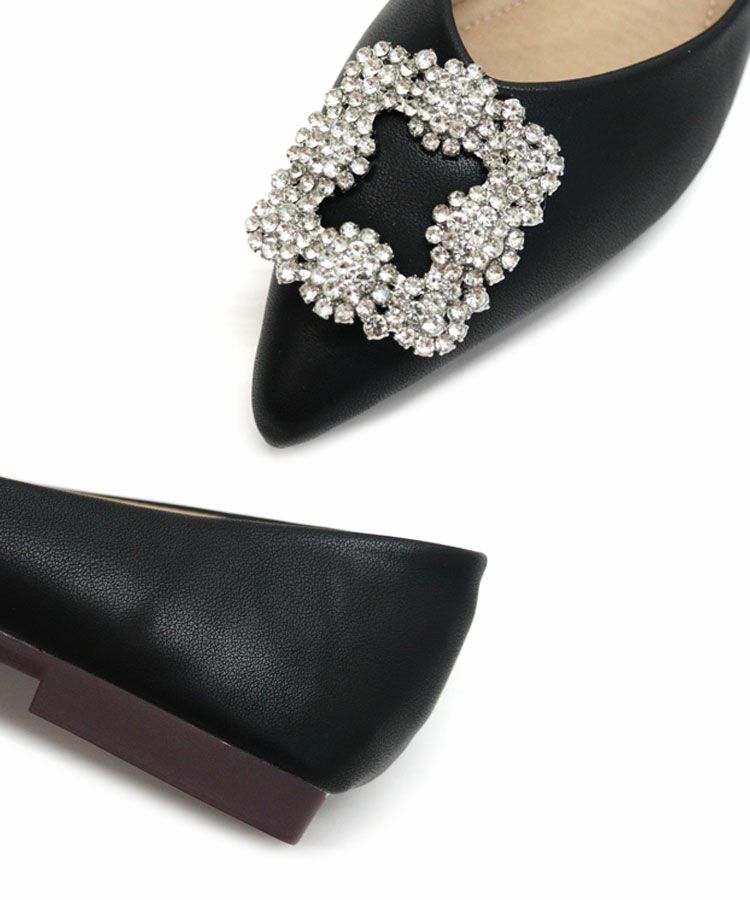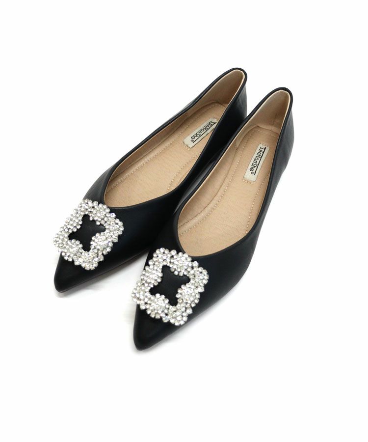 シンプルで美しいシルエットのパンプスに、大振りで煌びやかなスクエアビジューが映える1足。