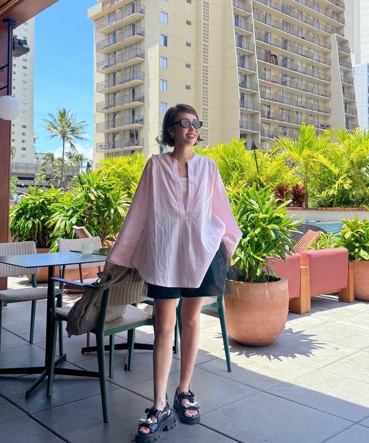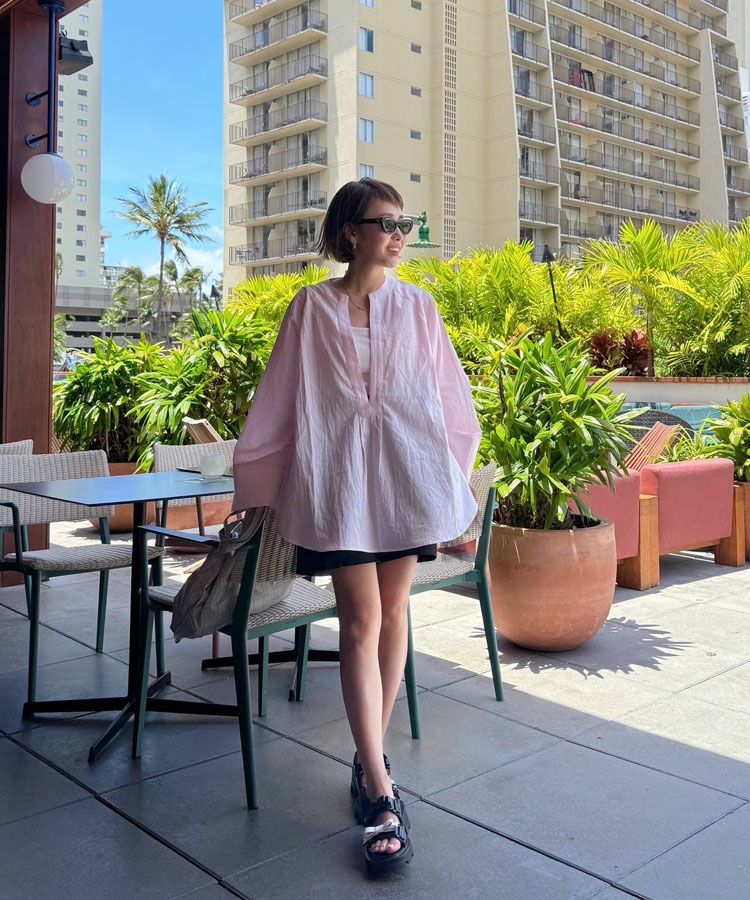 撥水バルーンパンツをデイリーに。水際にはもちろん、普段のスタイリングにも取り入れられるアイテム。雨の日にも大活躍の予感です。アキロンコラボサンダルをソックス合わせで。