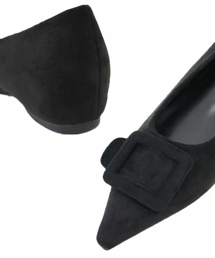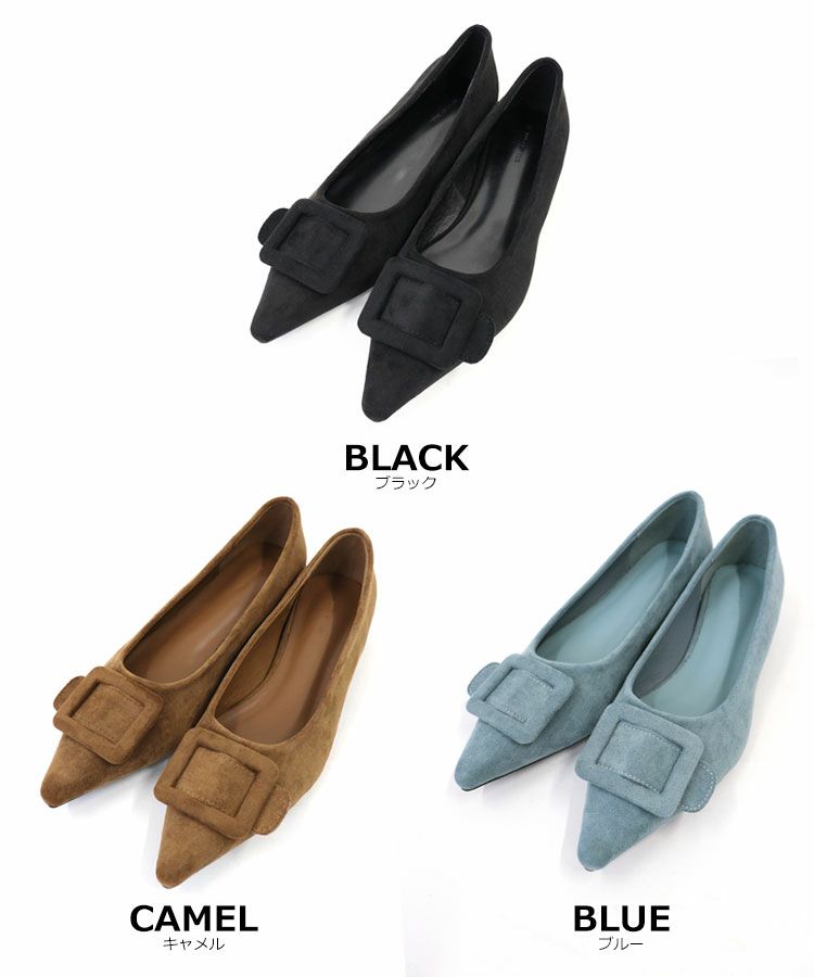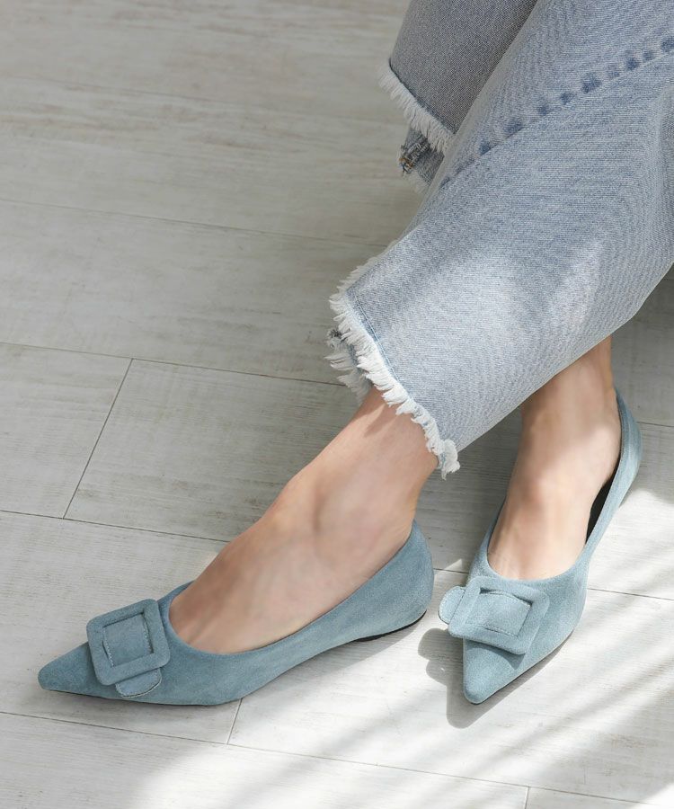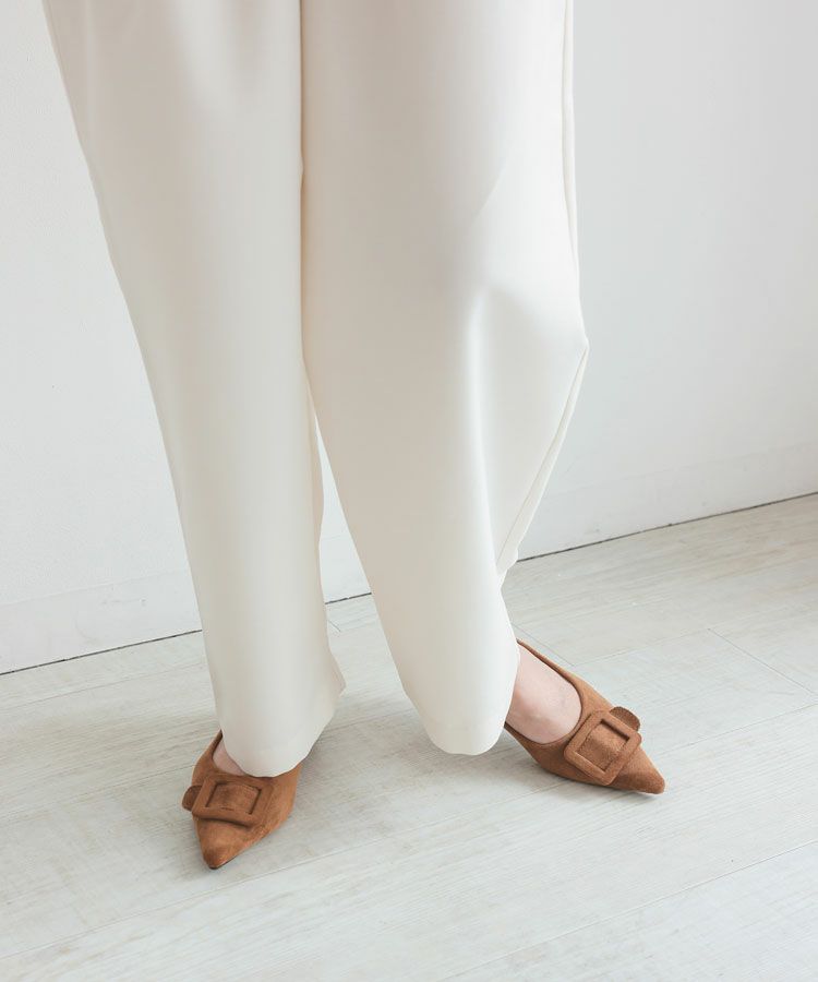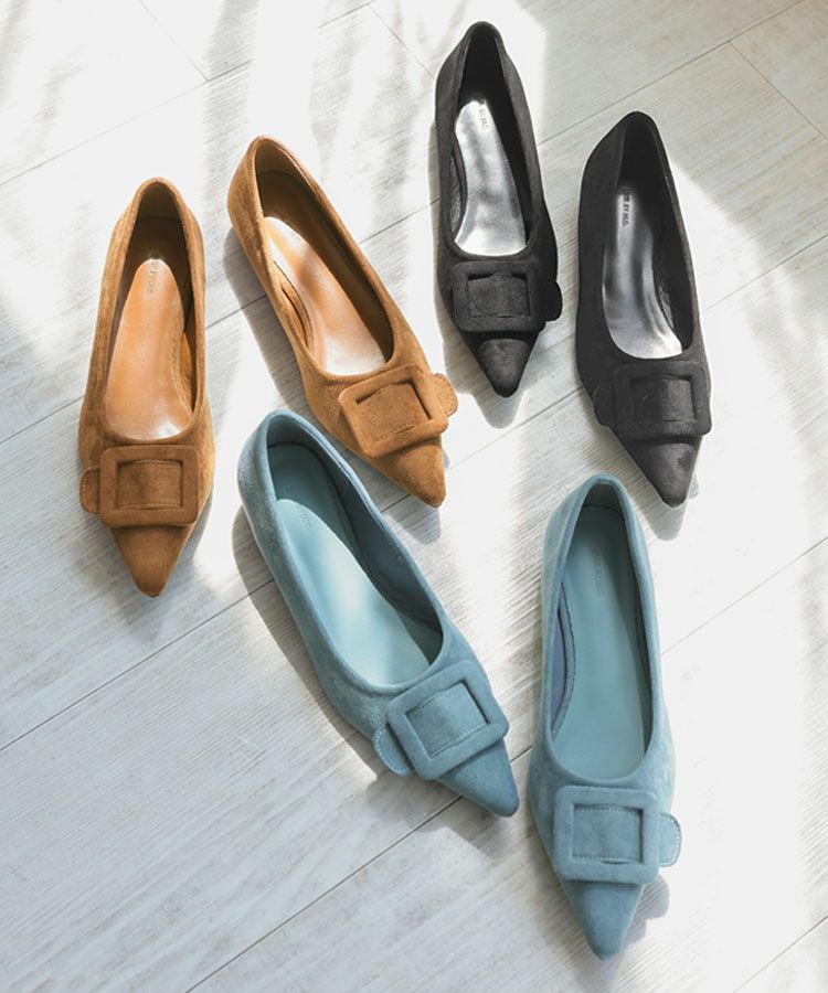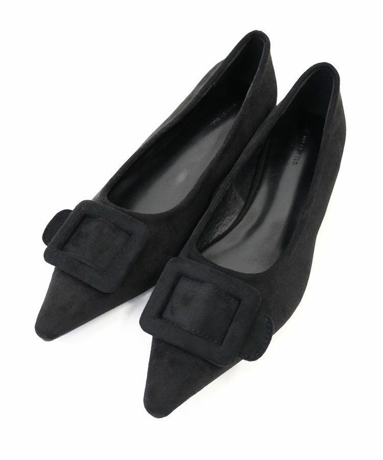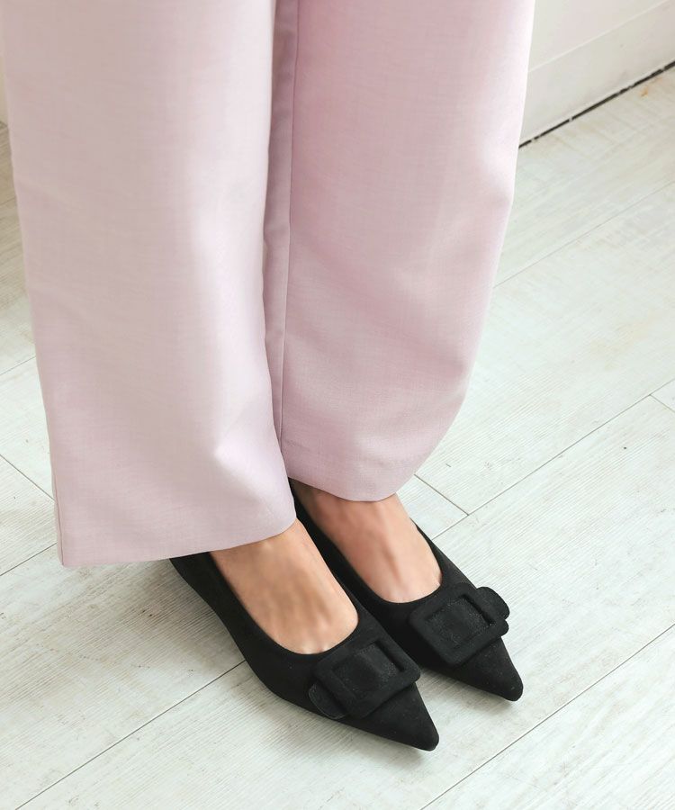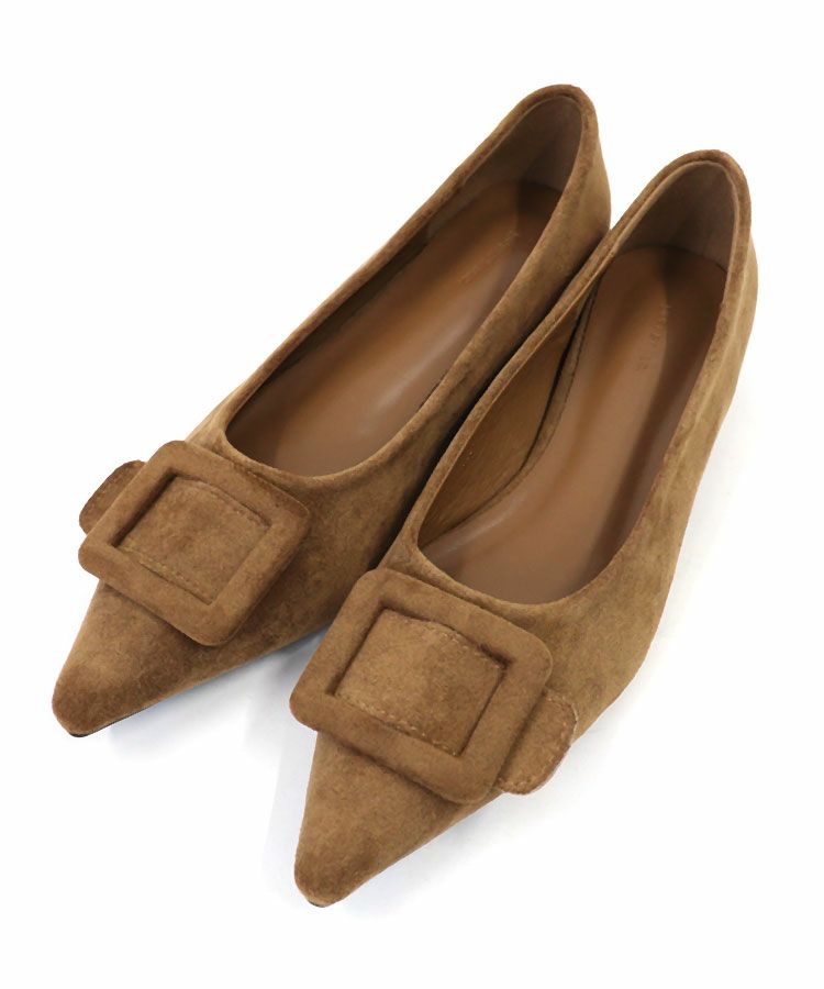 すっきりとしたポインテッドトゥと、フロントのバックル装飾が足元を上品にみせてくれ、大人の女性でも履きやすいデザインです。