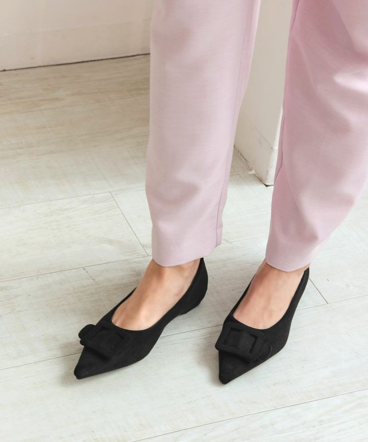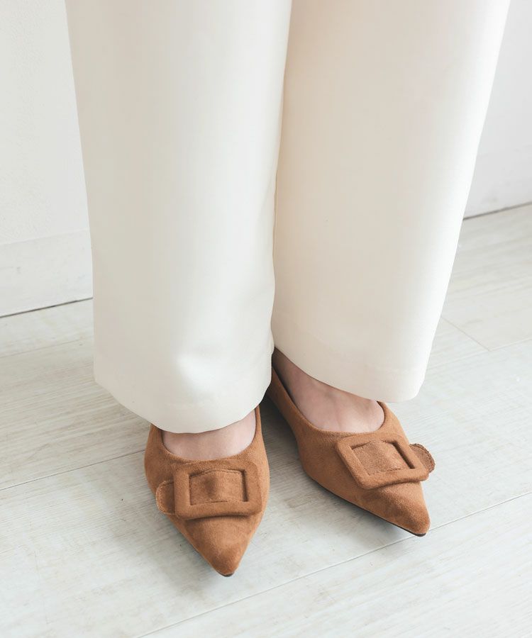 すっきりとしたポインテッドトゥと、フロントのバックル装飾が足元を上品にみせてくれ、大人の女性でも履きやすいデザインです。