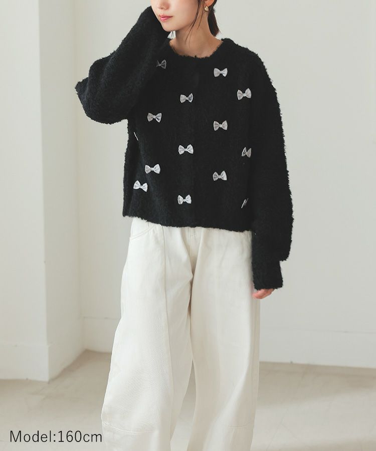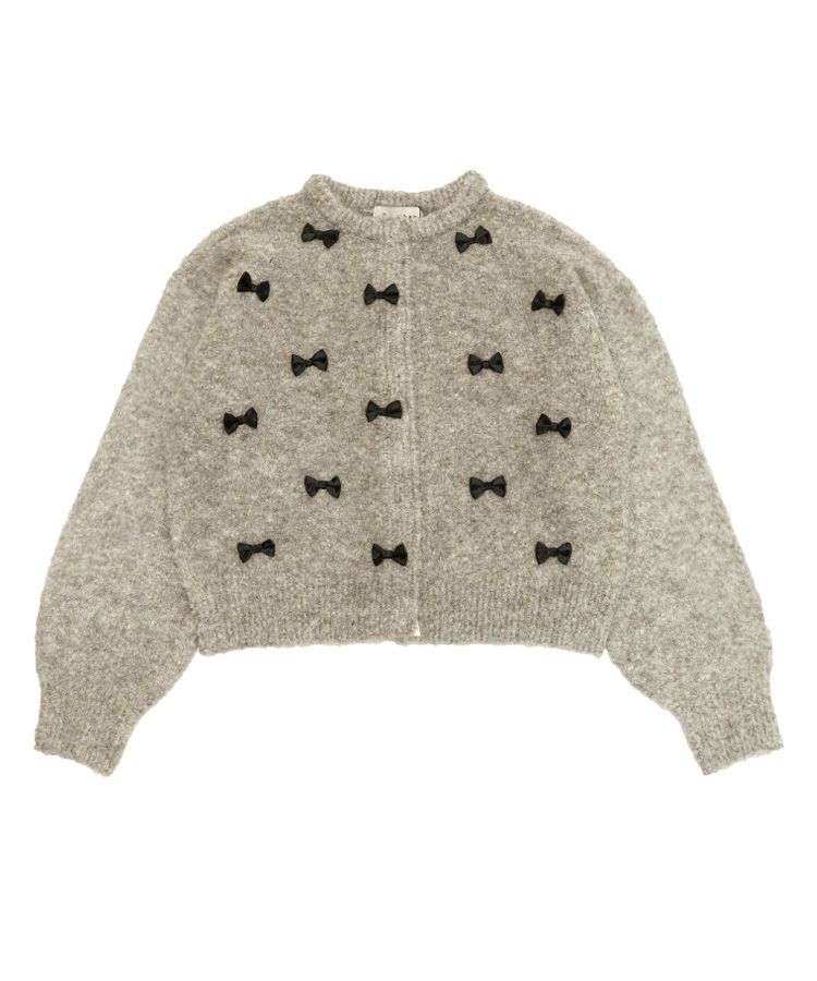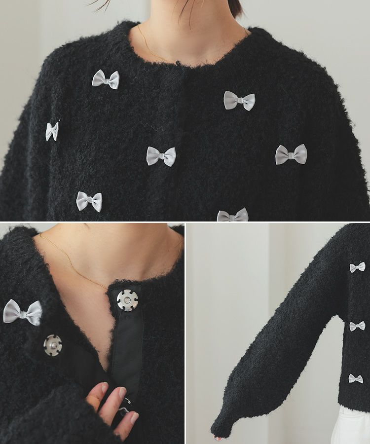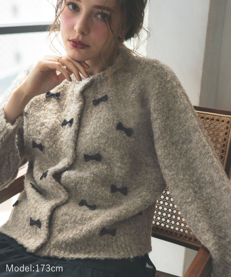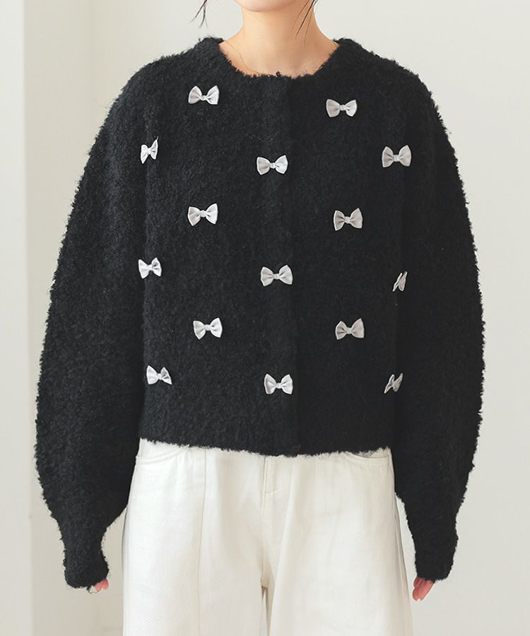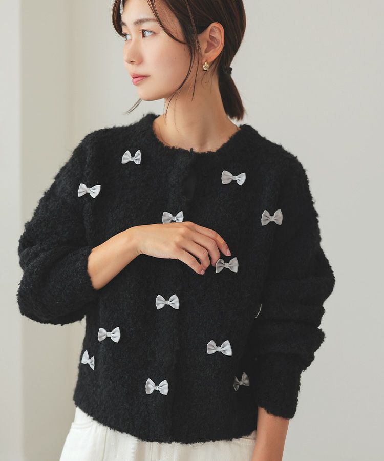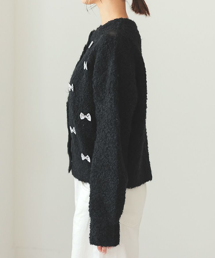 トレンド感のあるブークレ素材にミニリボンを散りばめたショート丈カーディガン。