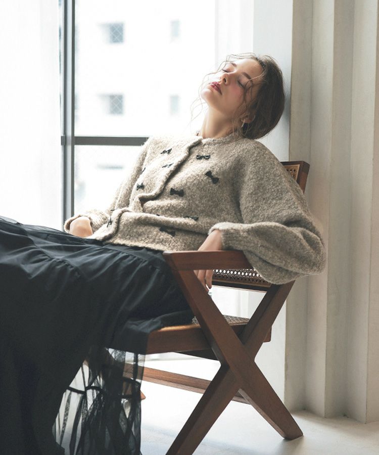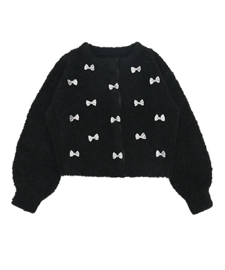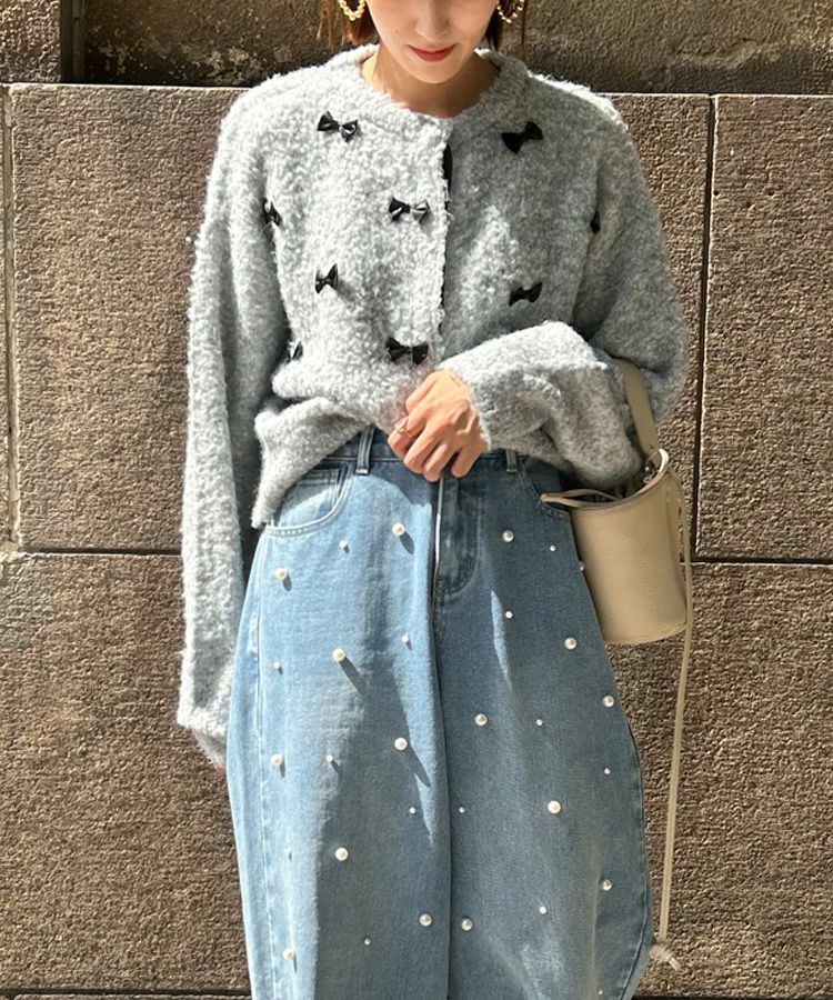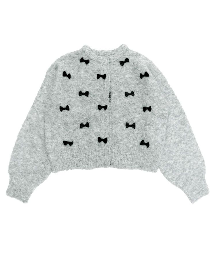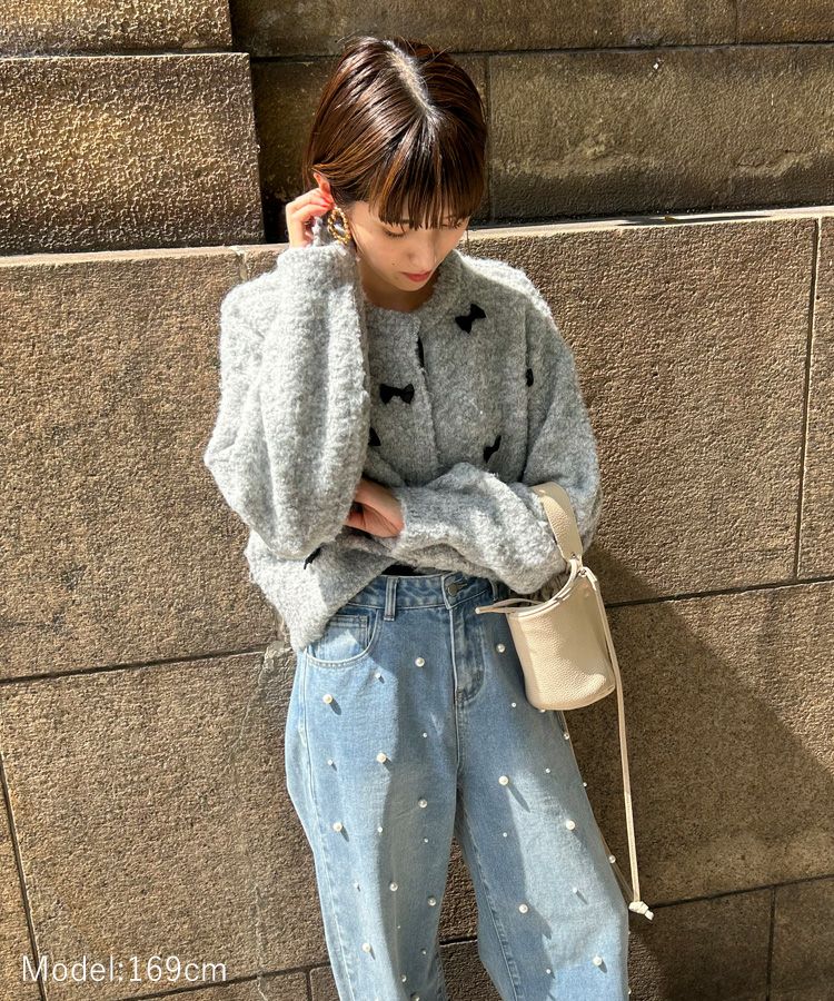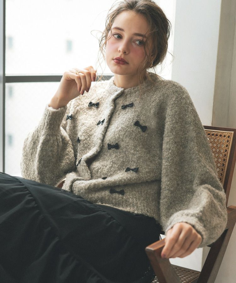 トレンド感のあるブークレ素材にミニリボンを散りばめたショート丈カーディガン。