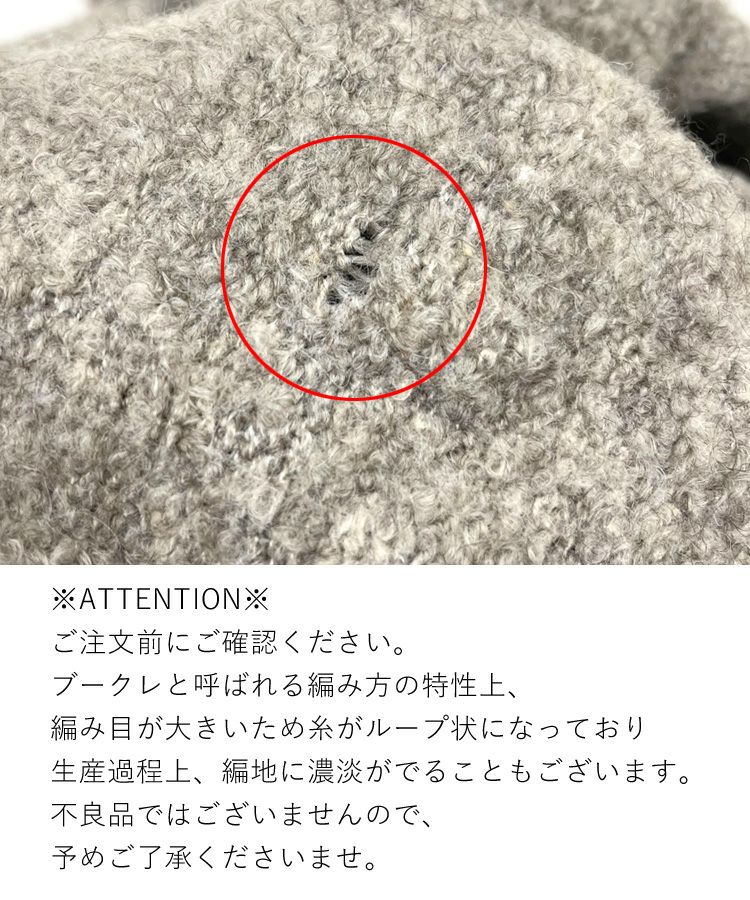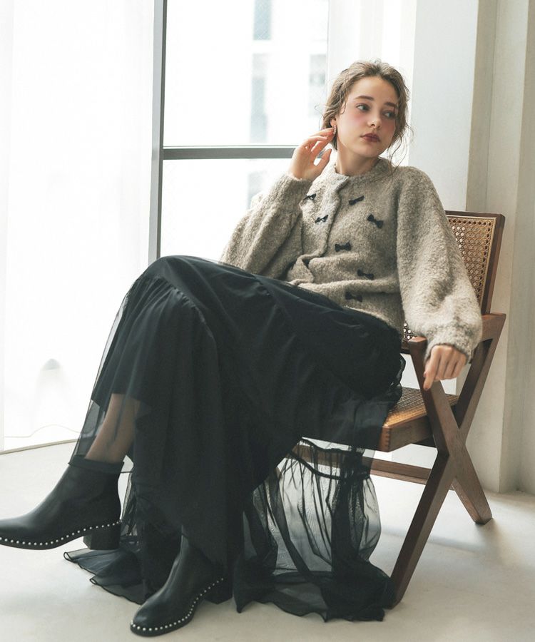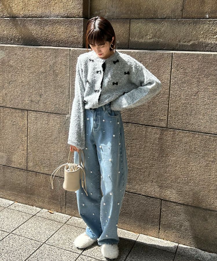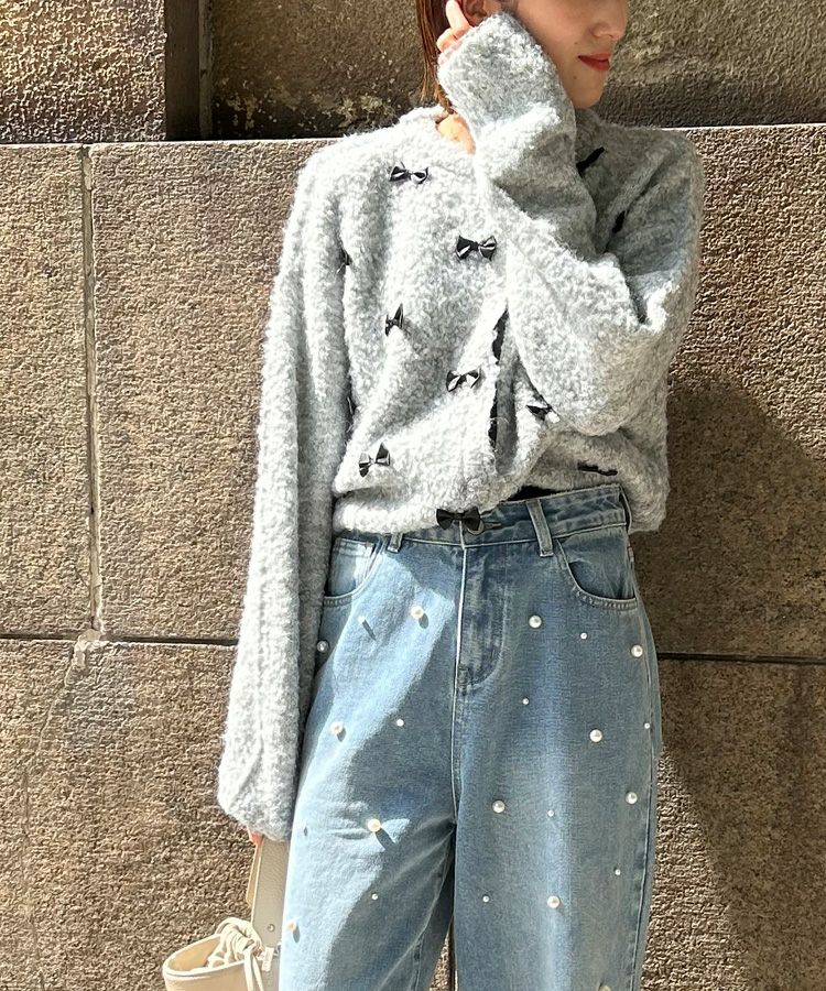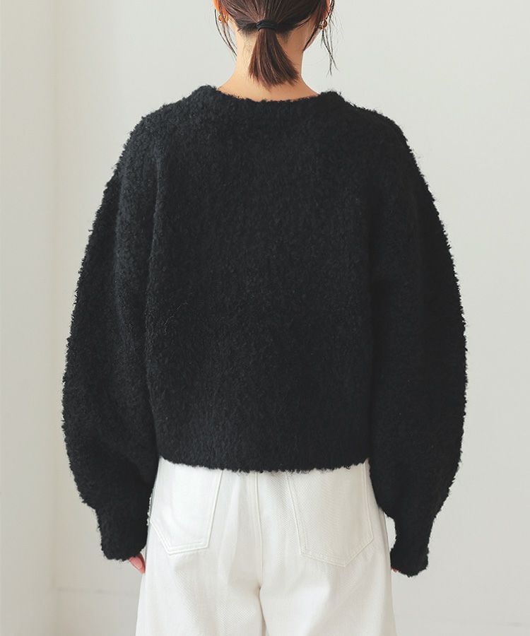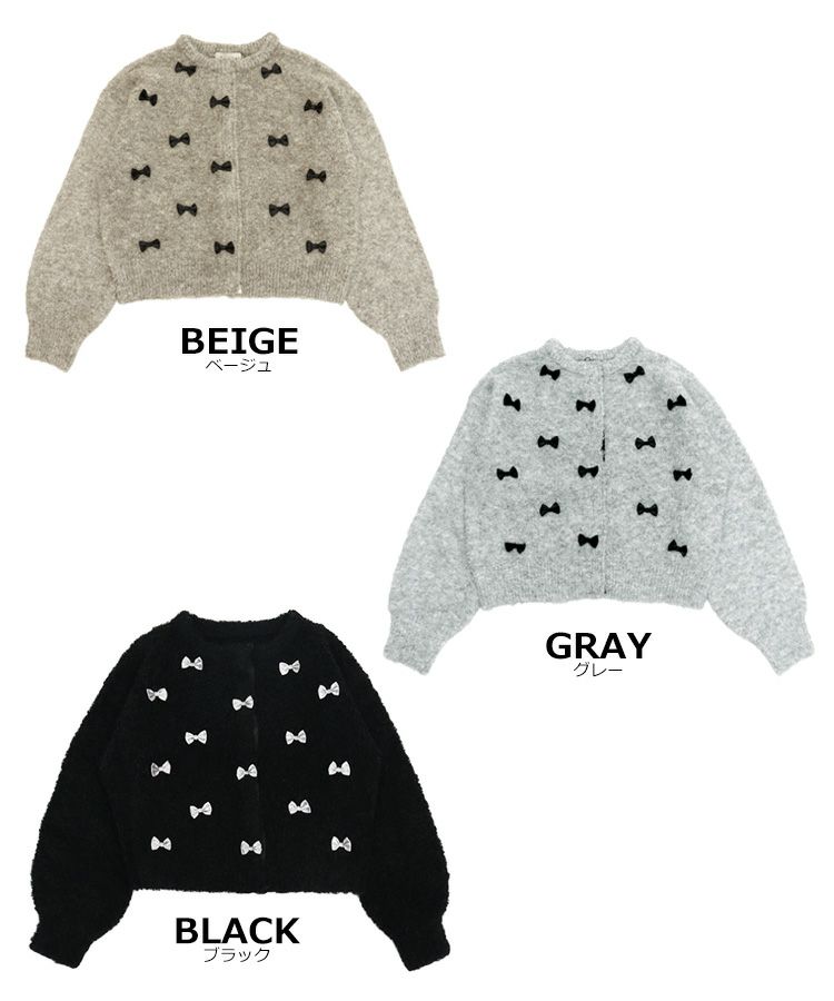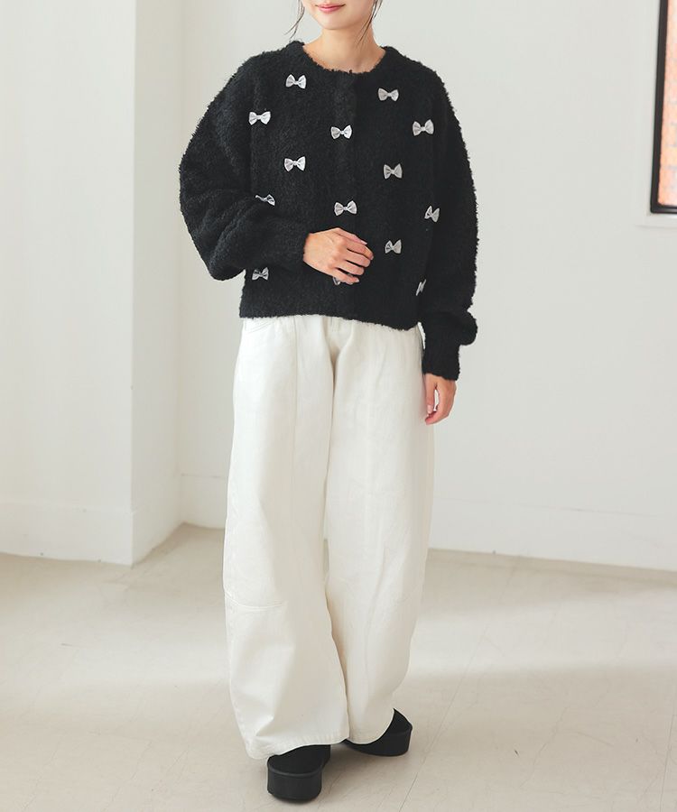 トレンド感のあるブークレ素材にミニリボンを散りばめたショート丈カーディガン。