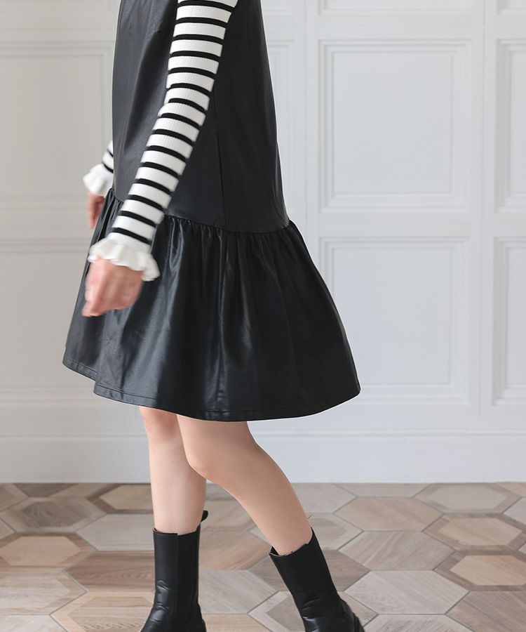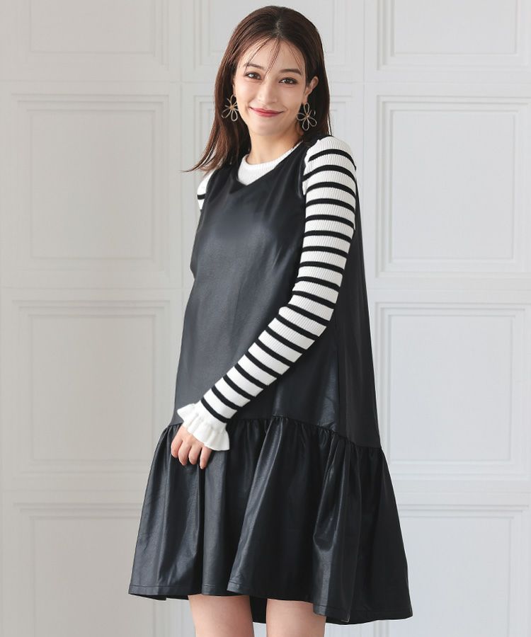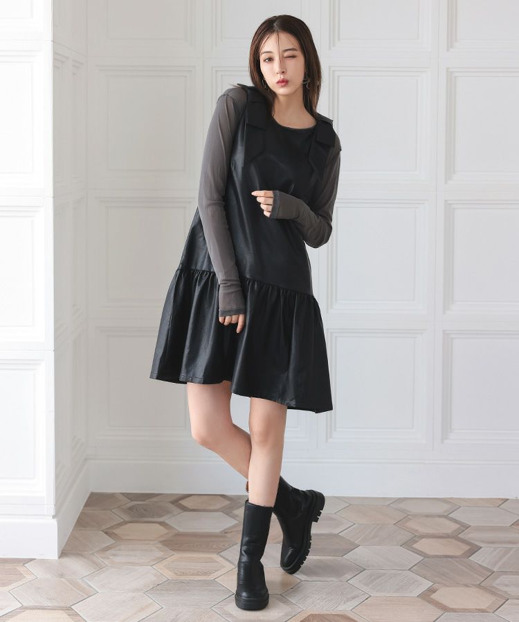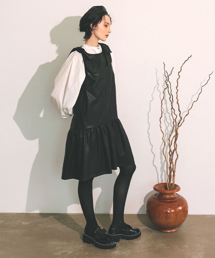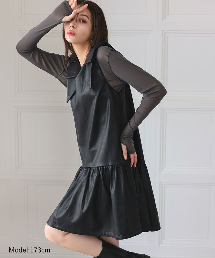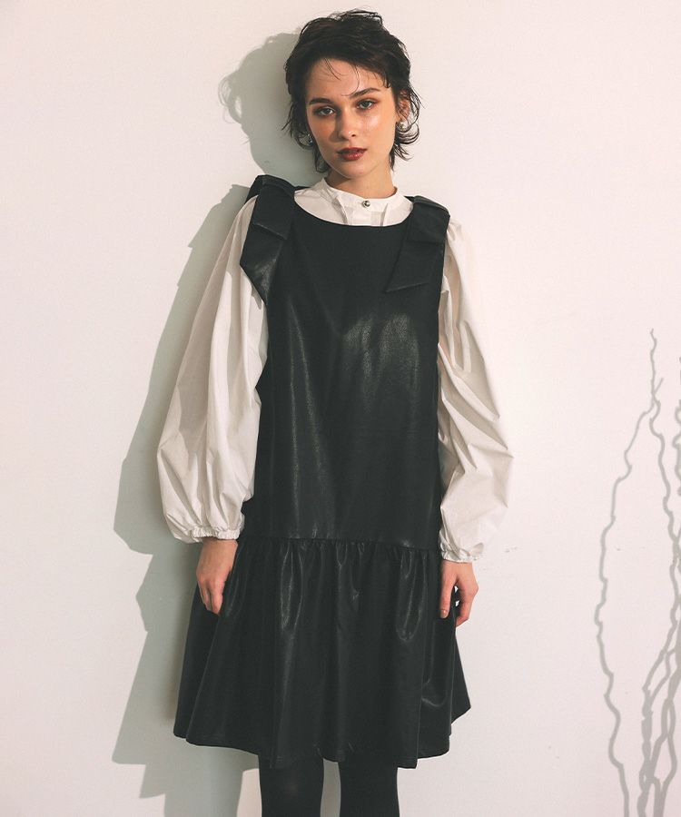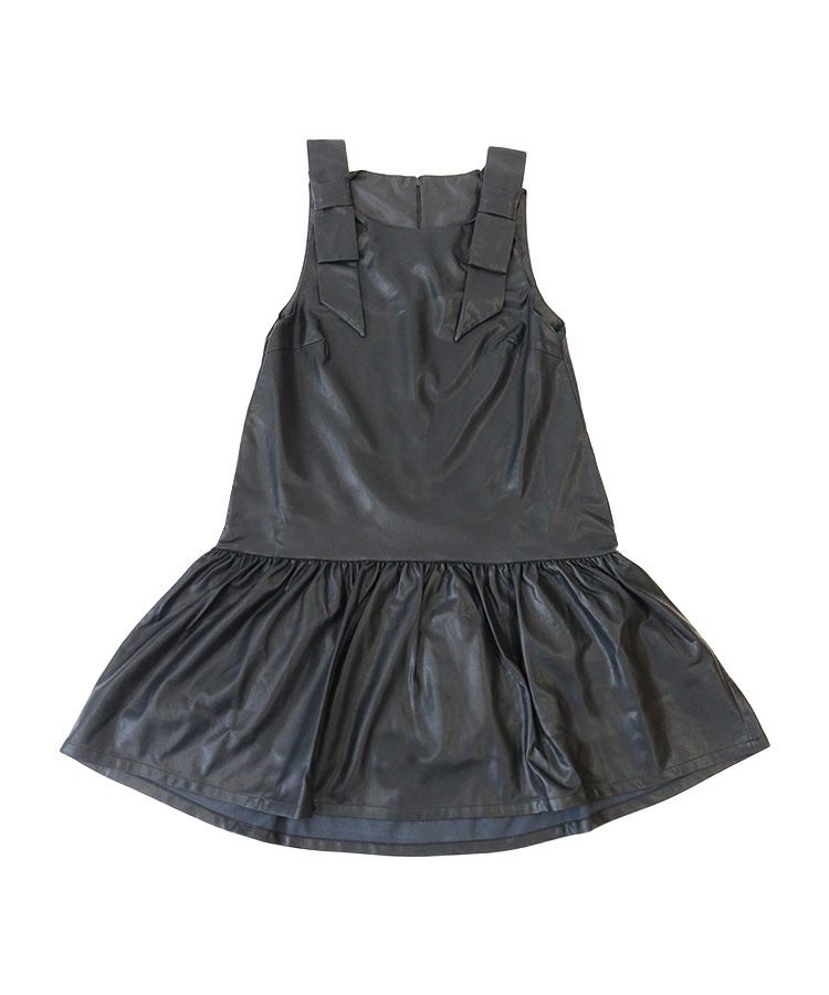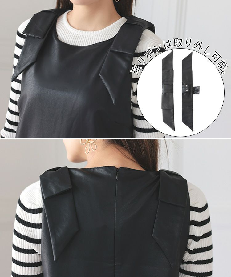 トレンド感のあるレザーライク素材で、ショルダーの大きめのリボンがポイントになってるワンピース。