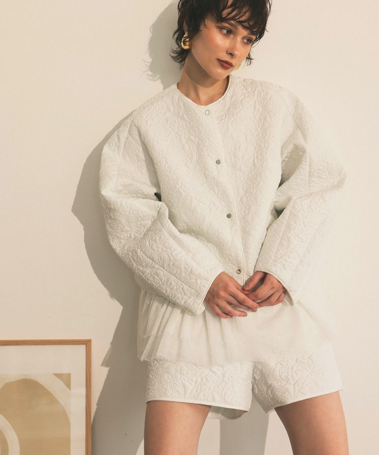 軽くて暖かいキルティングシリーズ。 ジャケットとショートパンツのホワイトセットアップは甘めスタイルがお好みの方におすすめです。 チュールが取り外しできるのも嬉しいポイント。