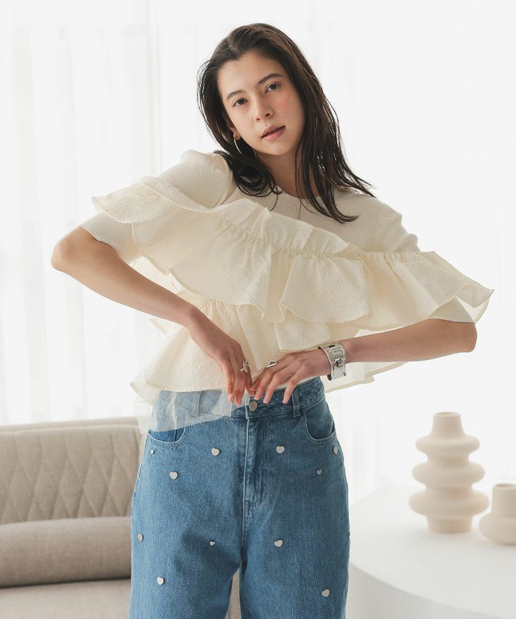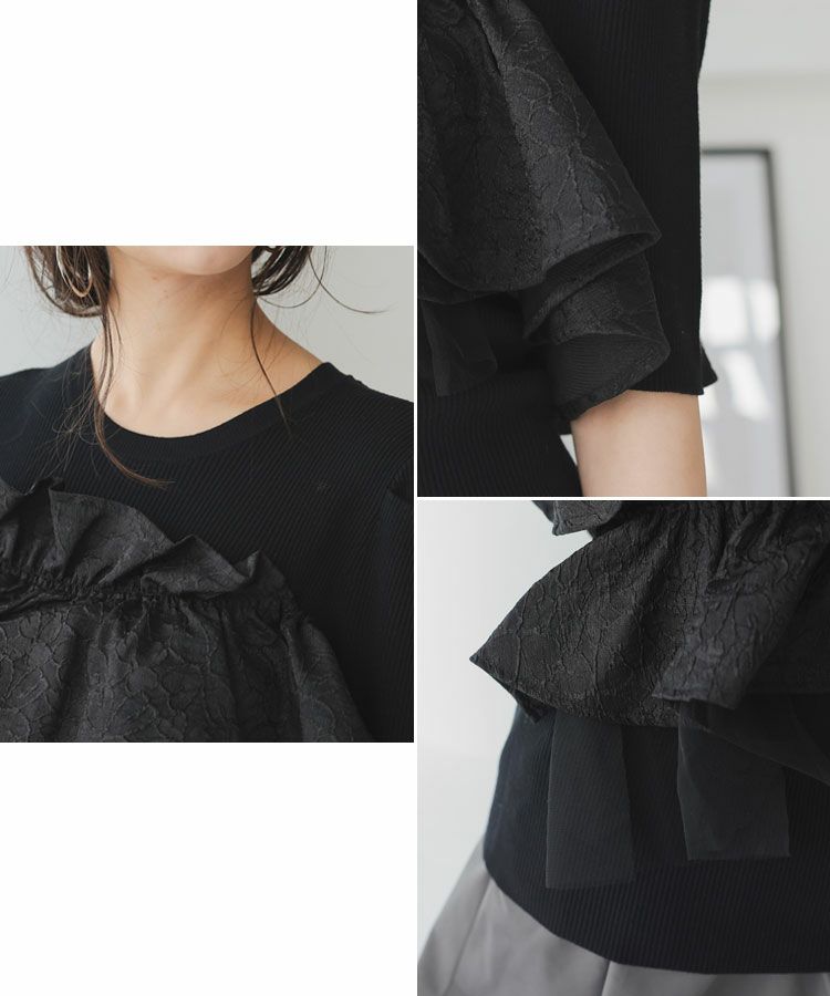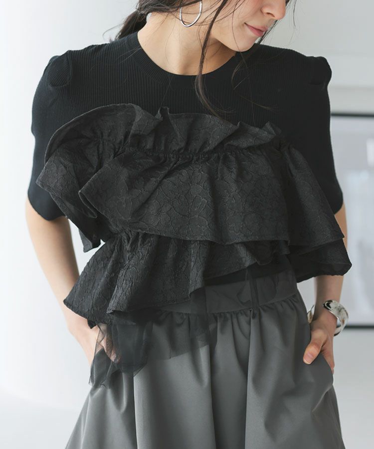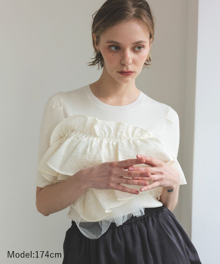 動きのあるジャガードフリルを肩の上に乗せたり、袖下に通して雰囲気を変えアレンジする事ができます。