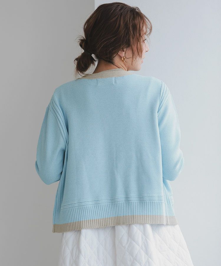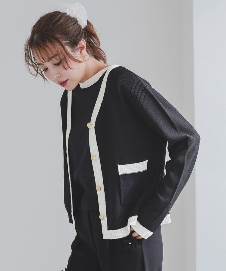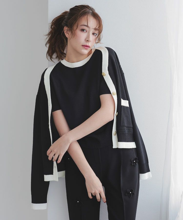 ルーのバイカラーアンサンブルが上品に映えるスタイリング。柔らかなグレーのキルティングスカートを合わせることで、大人の余裕が漂うコーデ◎