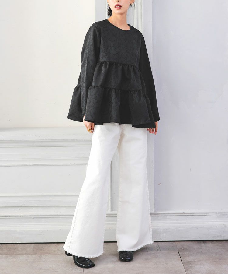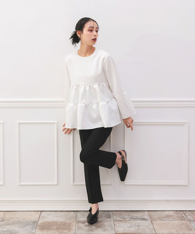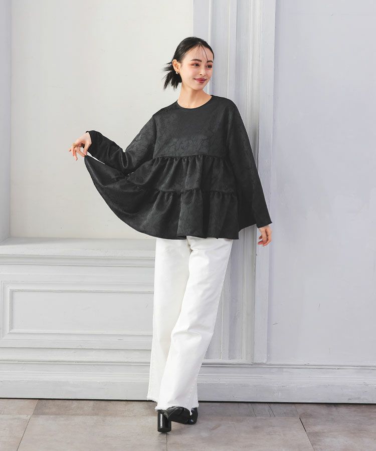 カオリさんがLIVEで着用されていたようにオケージョンセットアップに合わせたくてホワイトを購入しました!柔らかな素材の膨れジャガードが高級感があり、ジャケットのインナーとしても合わせやすいです。