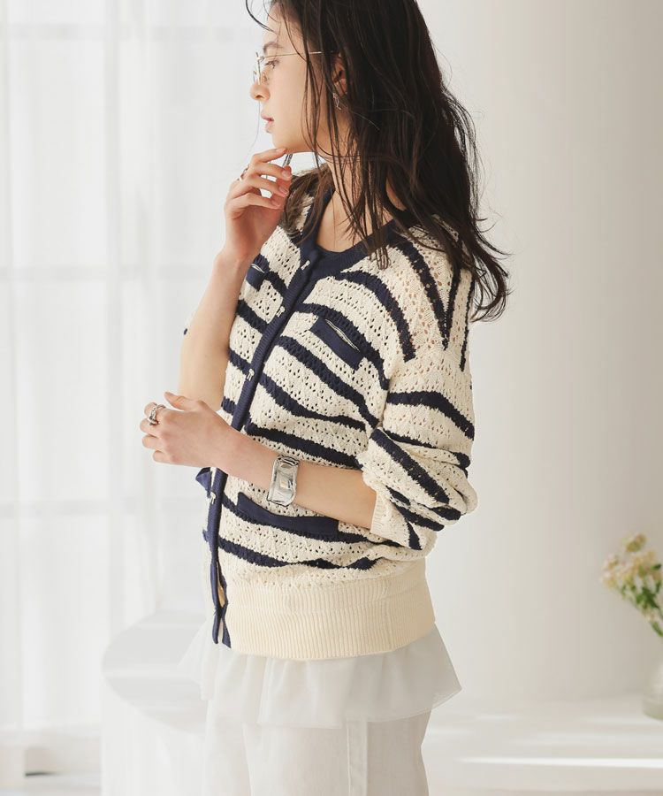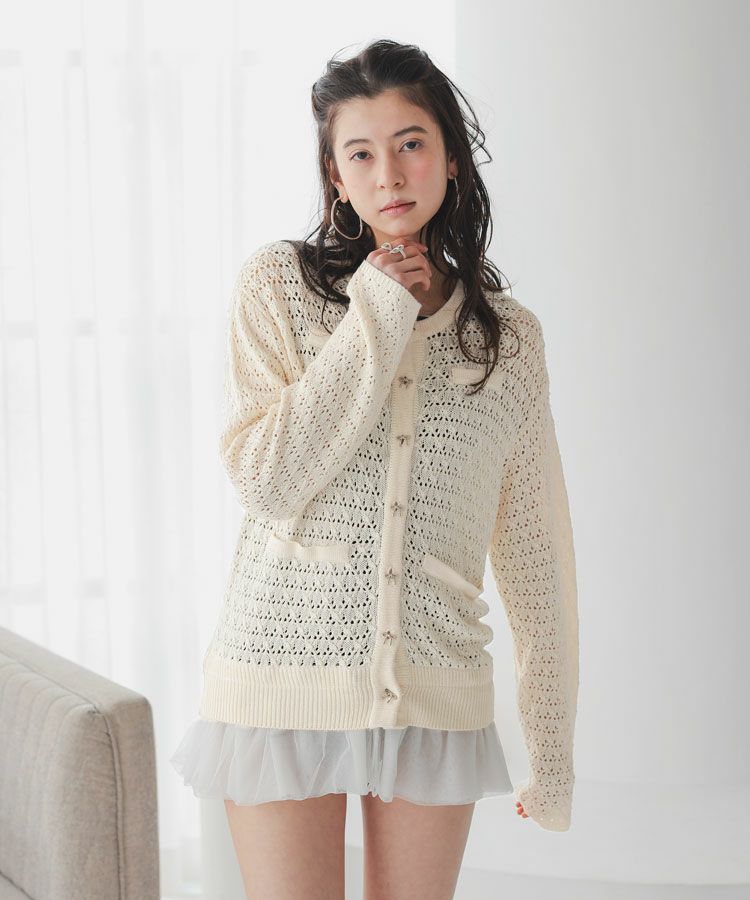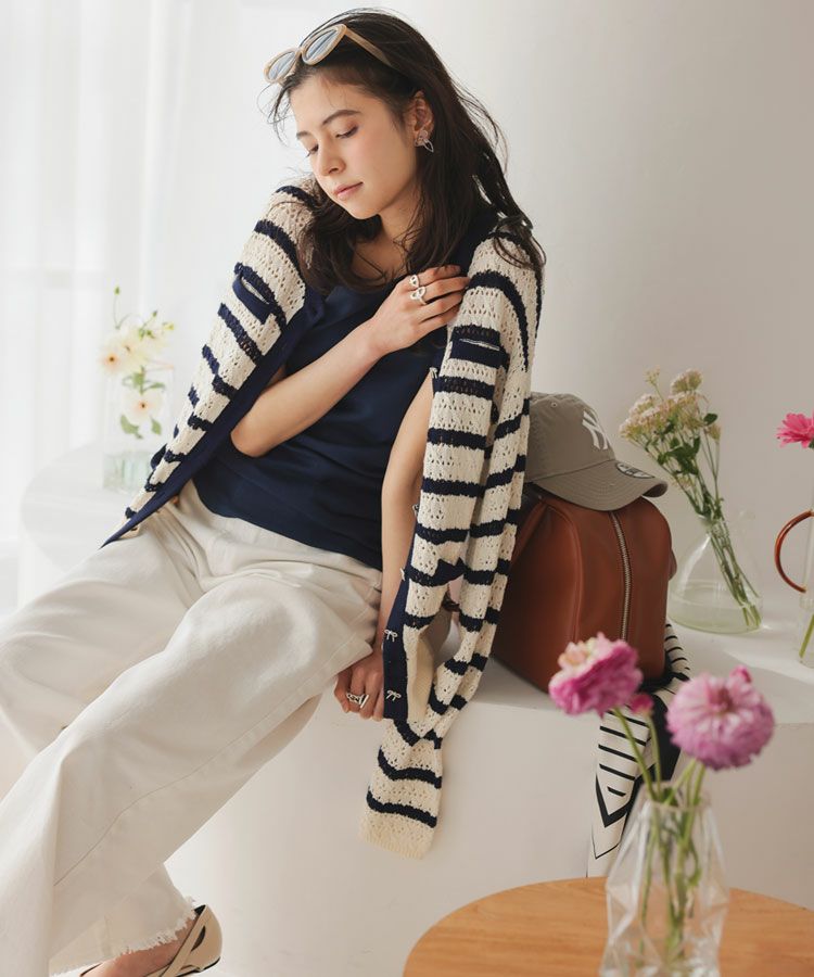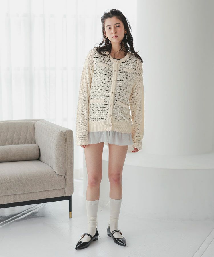 透け感のあるカーディガンに感動イージーサロペットを組み合わせた春コーデ。お腹周りとヒップ周りをカバーしつつ、トップスで透け感を出し細見えするようにしました。