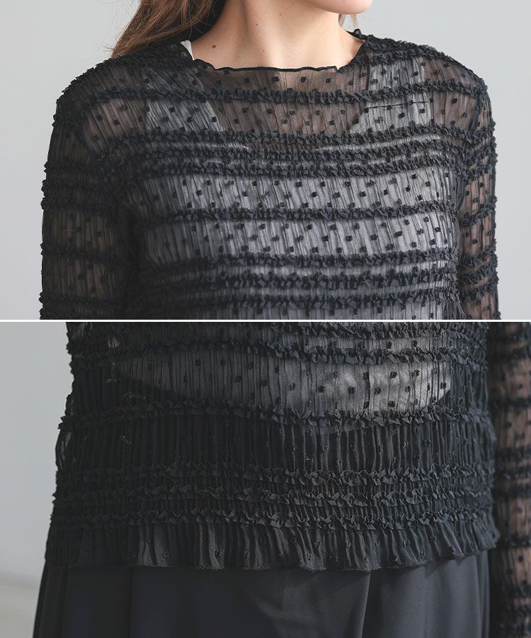 ドットとフリルテイストが盛り込まれた可愛い生地が主役級の大人気トップスから新色が登場。
