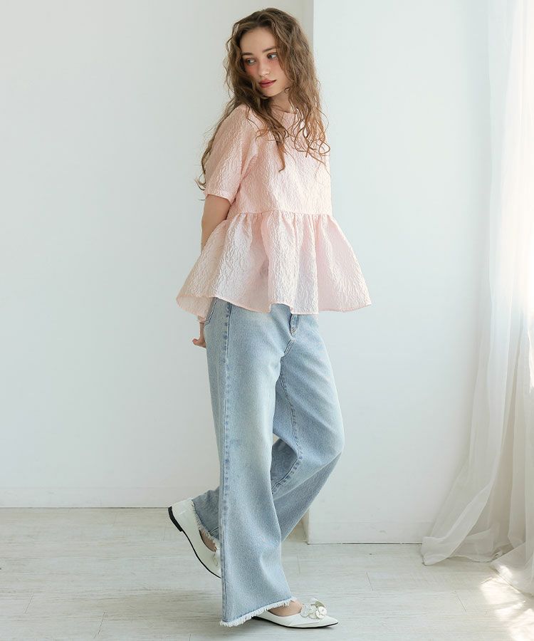 トップスは裾にかけて広がるペプラムデザインで、スタイルアップ効果も。